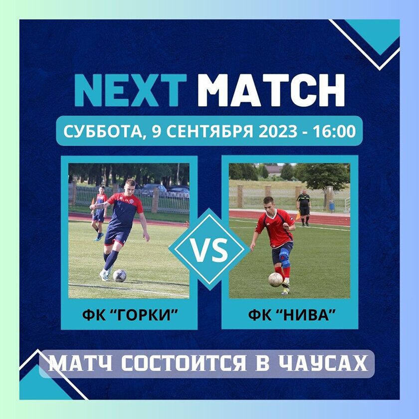 Заключительный матч группового турнира ФК «ГОРКИ» состоится 9 сентября 2023 года в Чаусах с местной командой ФК «НИВА». Начало в 16:00