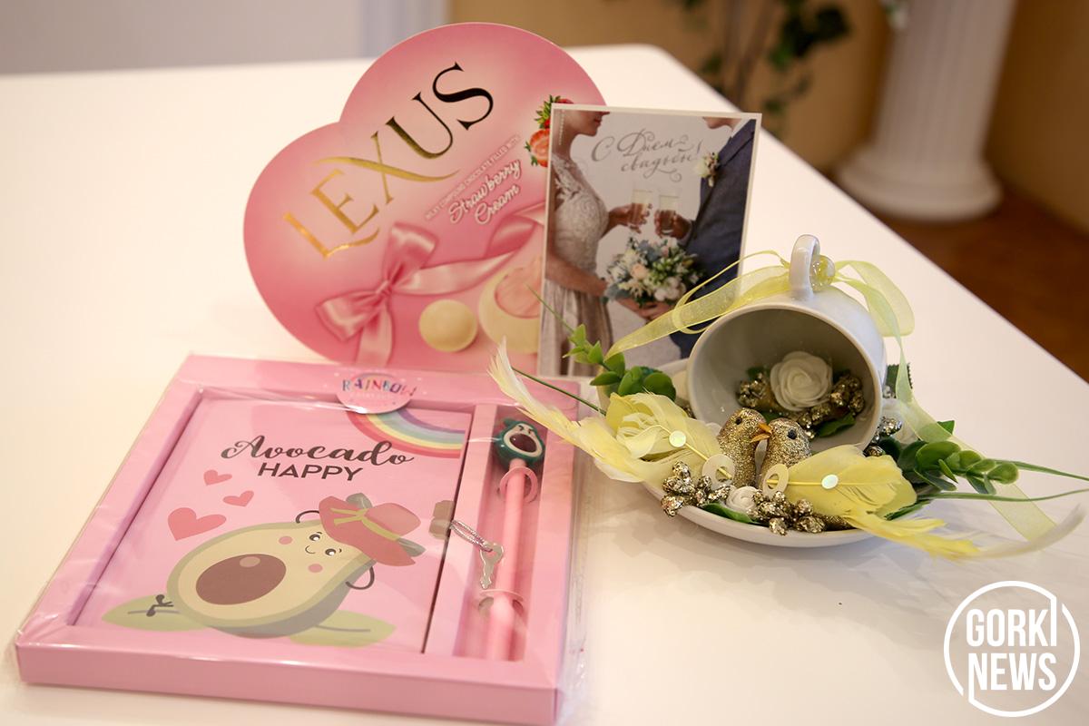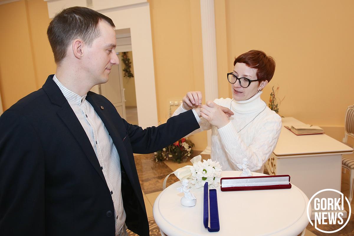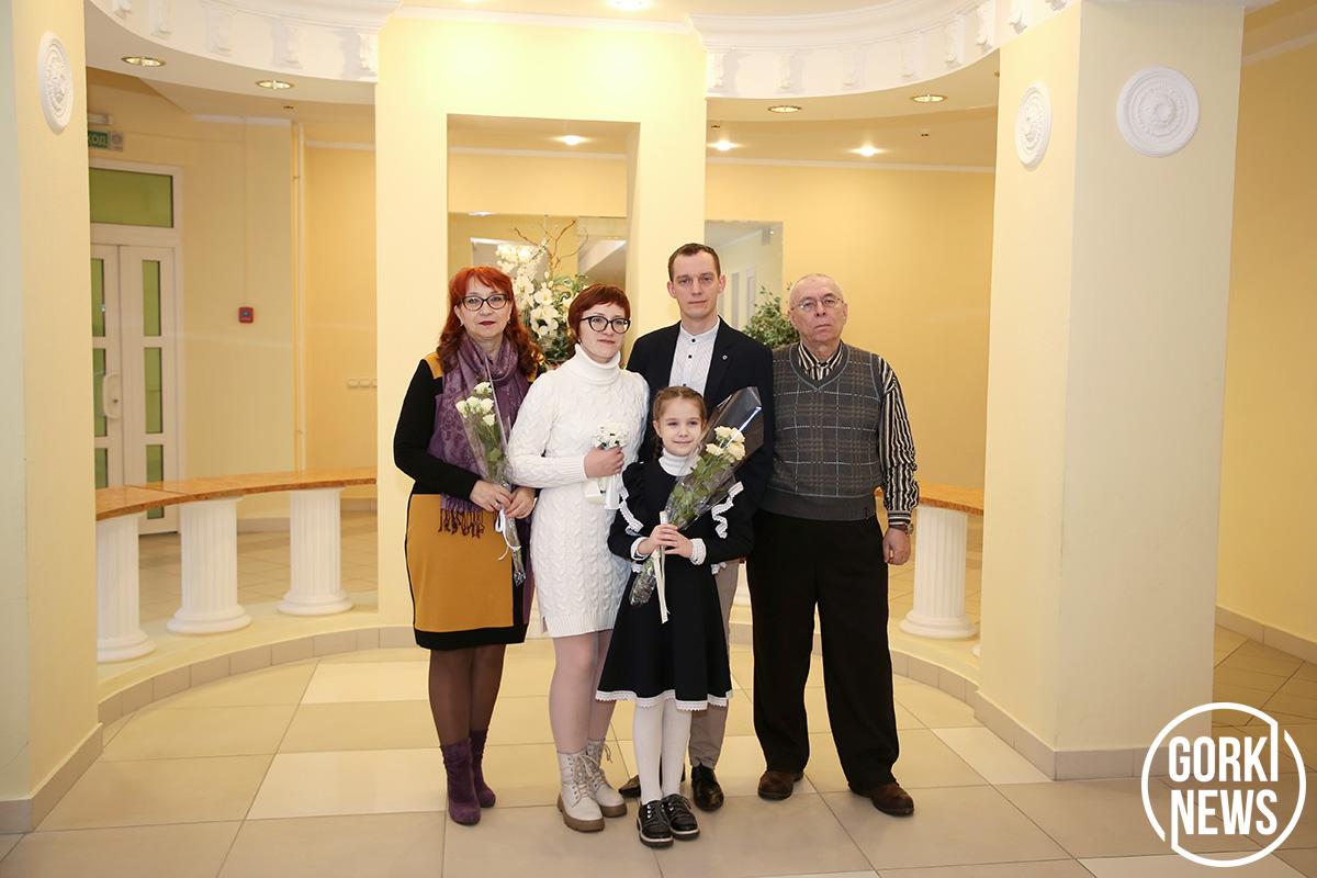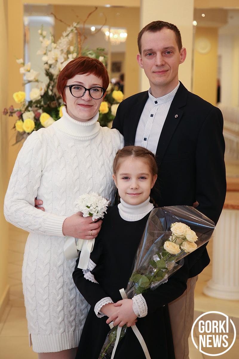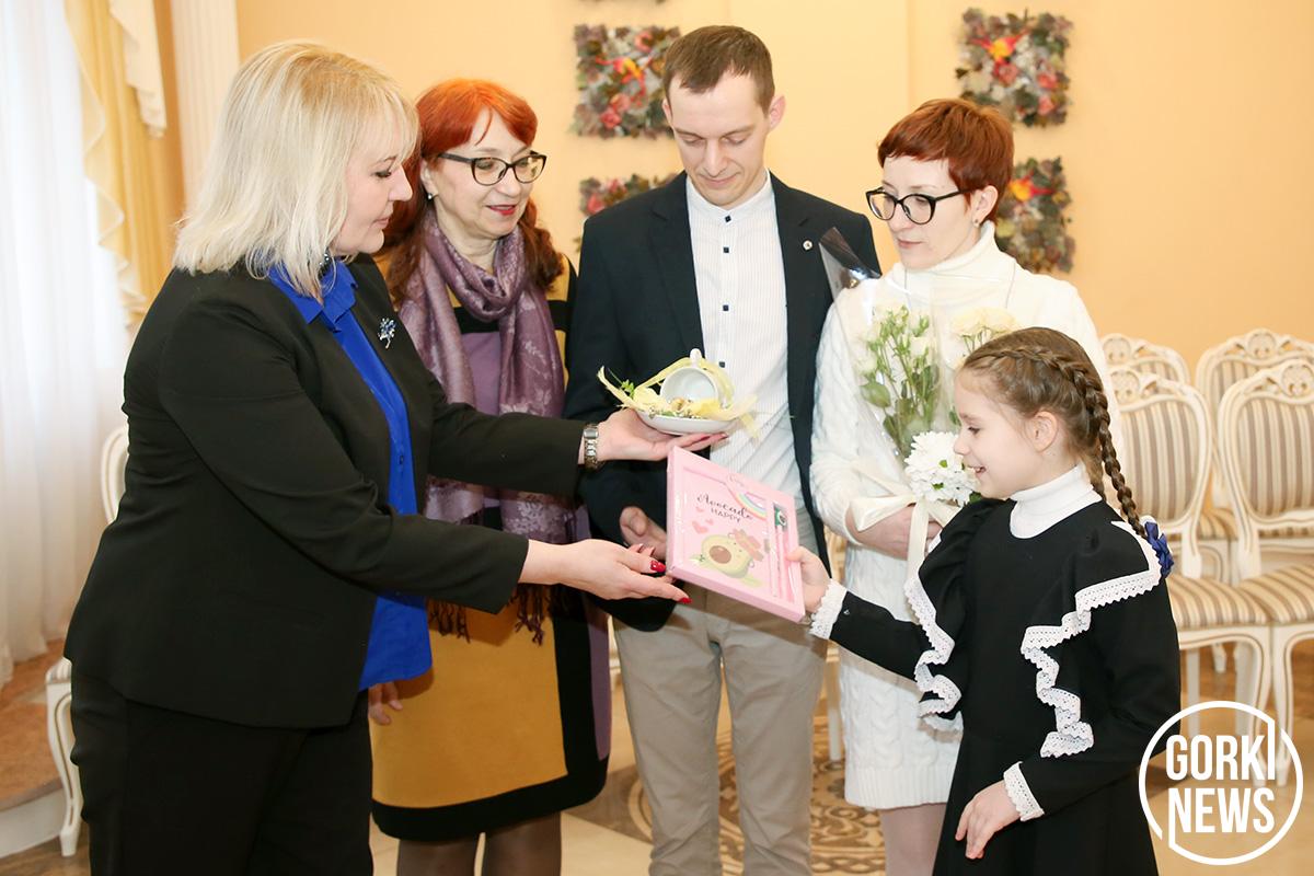 В нарядном церемониальном зале в первое весеннее утро собрались самые близкие и родные люди пары. Начальник отдела ЗАГС Горецкого райисполкома Наталья Мелехова предложила юбилярам вспомнить приятные моменты знакомства и принятия решения о браке, а также отметить наиболее значимые события совместной жизни. Далее семья сделала записи в Книге памятных событий, а их дочь Мария дополнила слова родителей милым рисунком.