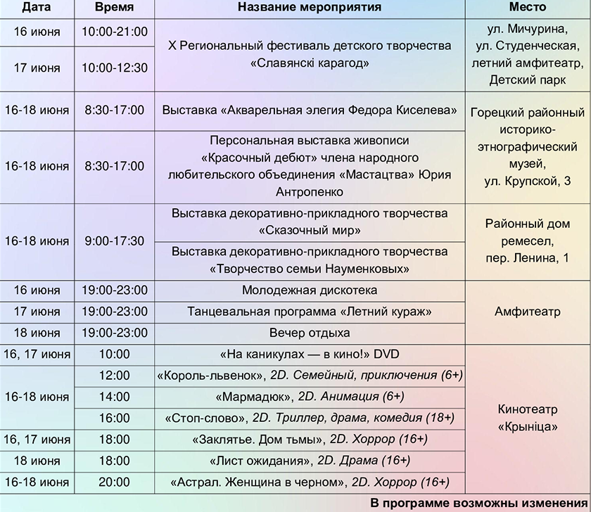 Афиша выходного дня Gorkinews 16 июня 2023 5:17 Теги афишакиноафишапопуляр Предыдущая новость Следующая новость С 13 по 16 июля состоится XXXII Международный фестиваль искусств «Славянский базар в Витебске» В дополнение к фоторепортажу — видео с выездного расширенного президиума Могилевского областного Совета депутатов