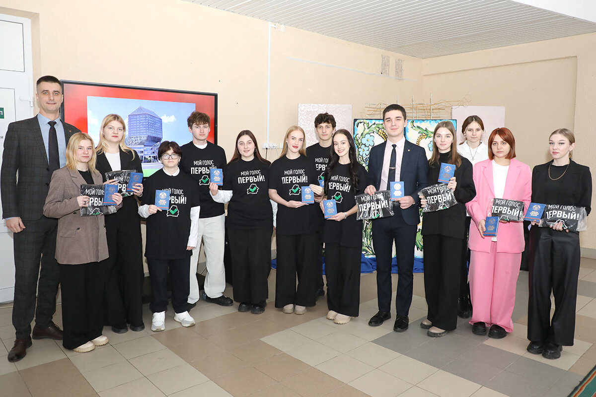 Волонтеры молодежного движения в рамках республиканской акции для впервые голосующих граждан «Твой голос первый» передали учащимся памятные футболки с логотипом.