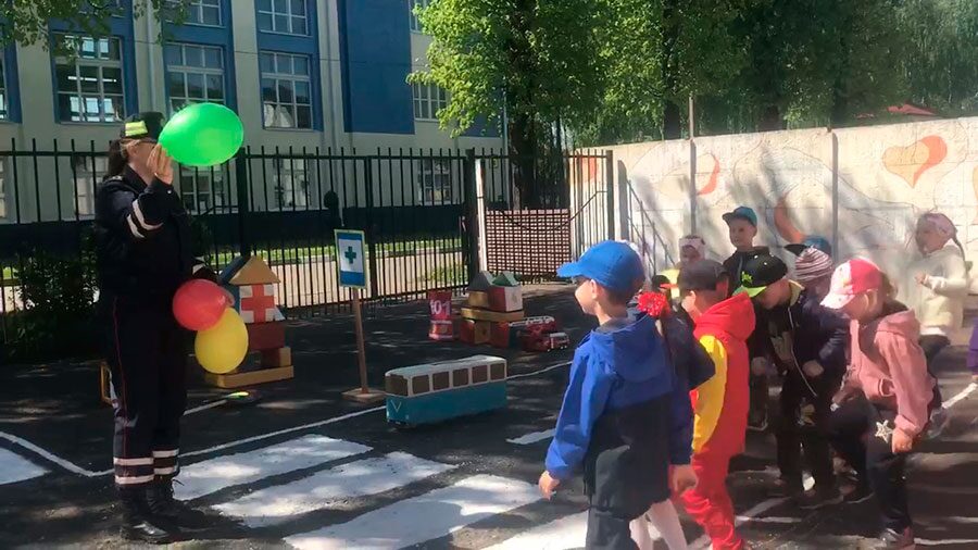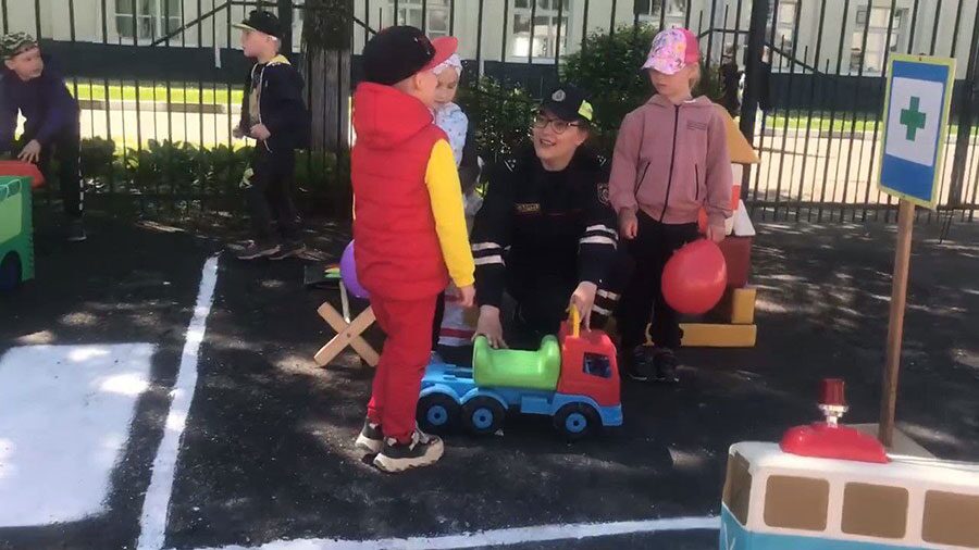 Для малышей на улице был организован настоящий автогородок с различными игровыми машинками и элементами дороги. Малыши вместе с инспекторами вспомнили как правильно переходить дорогу, сигналы светофора и познакомились с новыми дорожными знаками.