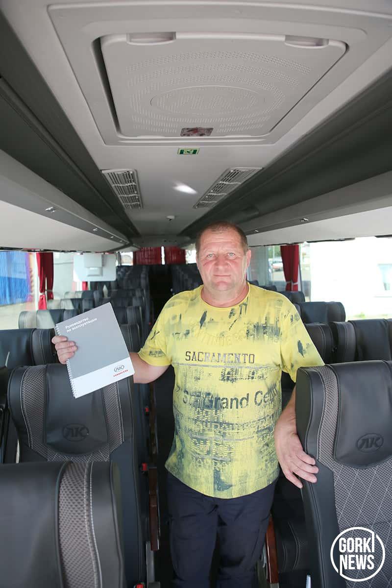 Ключи от него вручили опытному универсальному водителю Сергею Бухте, который более 40 лет занимается междугородними перевозками пассажиров и имеет необходимые для этого категории и допуски. Подчеркивает, что доставка пассажиров – ответственное дело. Ведь речь идет о сохранности жизни и здоровья людей на дорогах. Передвигаться на таком удобном и комфортабельном автобусе – одно удовольствие как для водителя, так и для пассажиров. Они сидят на удобных мягких сиденьях, которые можно раздвинуть и отрегулировать. Внизу есть специальные перекладины для ног, сверху индивидуальный климат-контроль, вентиляция, освещение. Впереди – специальная подставка для кофе и гаджетов. В салоне есть кондиционер, холодильник, кулер для воды, два телевизора, установлены камеры видеонаблюдения, которые позволяют контролировать обстановку.