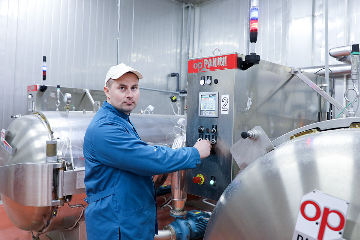 Главное требование собственника предприятия Евгения Федоровича и директора ООО “МиТЕОС” Владимира Малыхина – это 100% обес­печение высокого качества продукции, которое начинается с идеальной чистоты во всех производственных цехах, где производят продукцию с неукоснительным соблюдением всех санитарно-гигие­нических и ветеринарных требований, действующих в государстве, благодаря конт­ролю главного врача предприятия Екатерины Дрик. Во всех производственных помещениях установлены вентиляция, системы климат-контроля, кондиционирования воздуха и очистки воды. Работники предприятия, а это более 30 человек, трудятся в современных условиях, в светлых и просторных помещениях на высокотехнологичном качественном оборудовании итальянского, российского и польского производства. Все компьютеризировано. Его в свое время грамотно выбрал и приобрел Анатолий Федорович, который предъявлял высокие требования к оснащению производственных линий предприятия. Владимир Александрович не без гордости отметил, что, например, итальянские автоклавы фирмы “Panini”, где варится продукция, – одни из самых лучших в мире. Подбор и регулирование температуры, давления и времени варки позволяют производить тушенку необходимой мягкости, что сказывается на высоком качестве продукции.