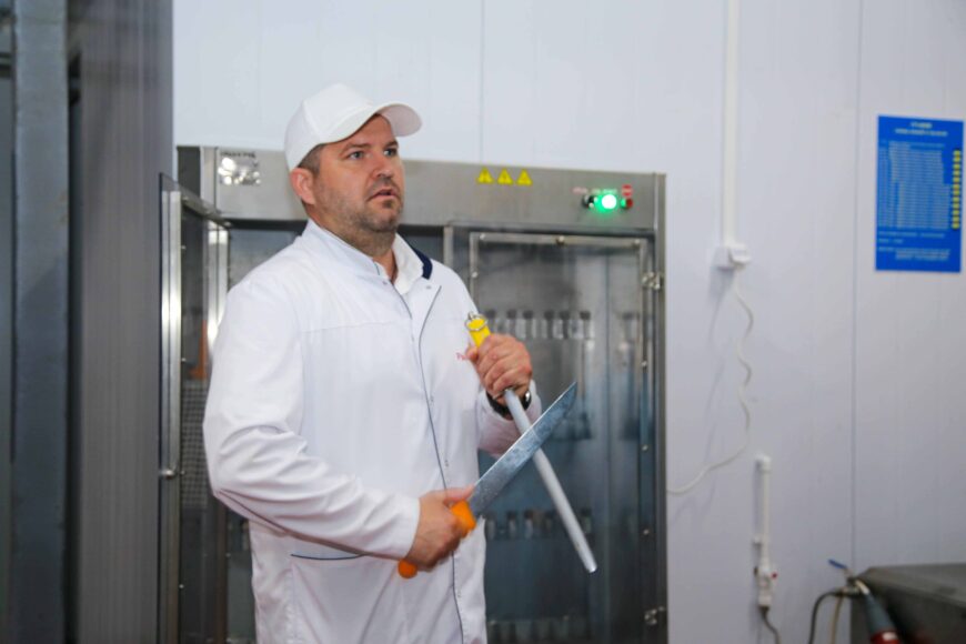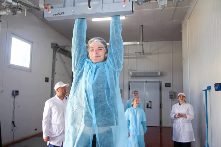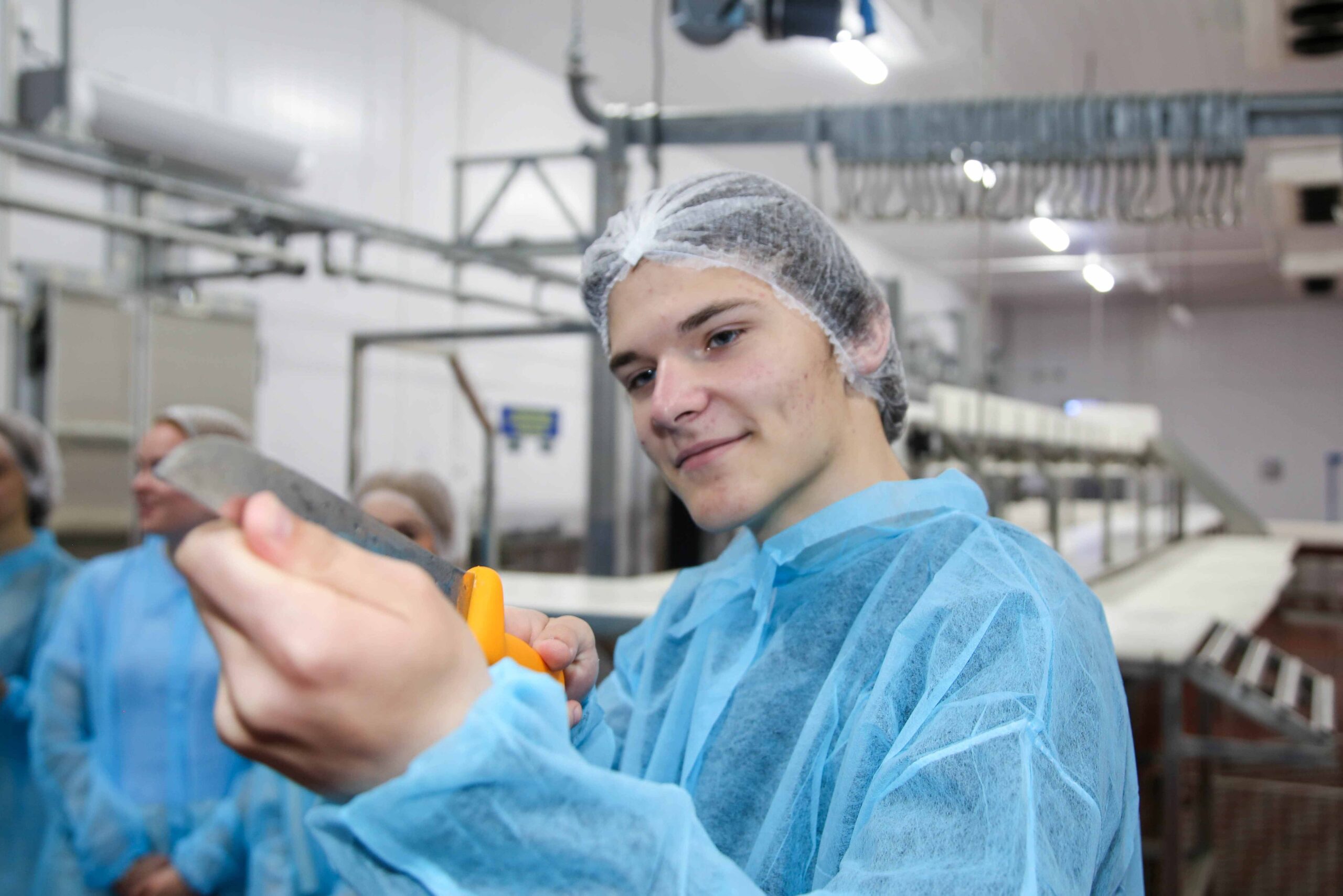 Молодых людей встретил директор предприятия Денис Рыженков, который с улицы показал административное и производственное здания, а также объяснил, что они объединены для соблюдения всех санитарных и ветеринарных норм.