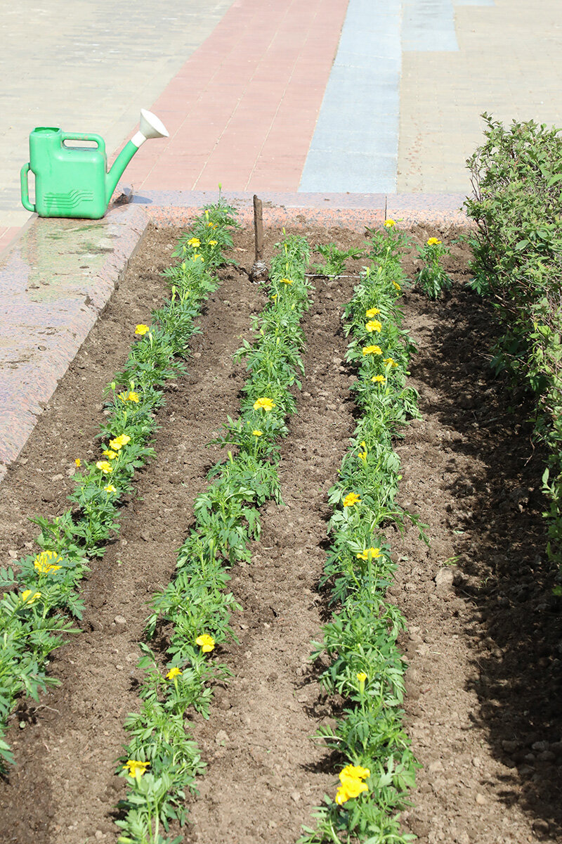 Сегодня озеленители трудятся на площади Центральной. Ухаживают за главной клумбой, на которой растения были высажены вчера. Аккуратно завершают работу на боковых цветочных площадках.