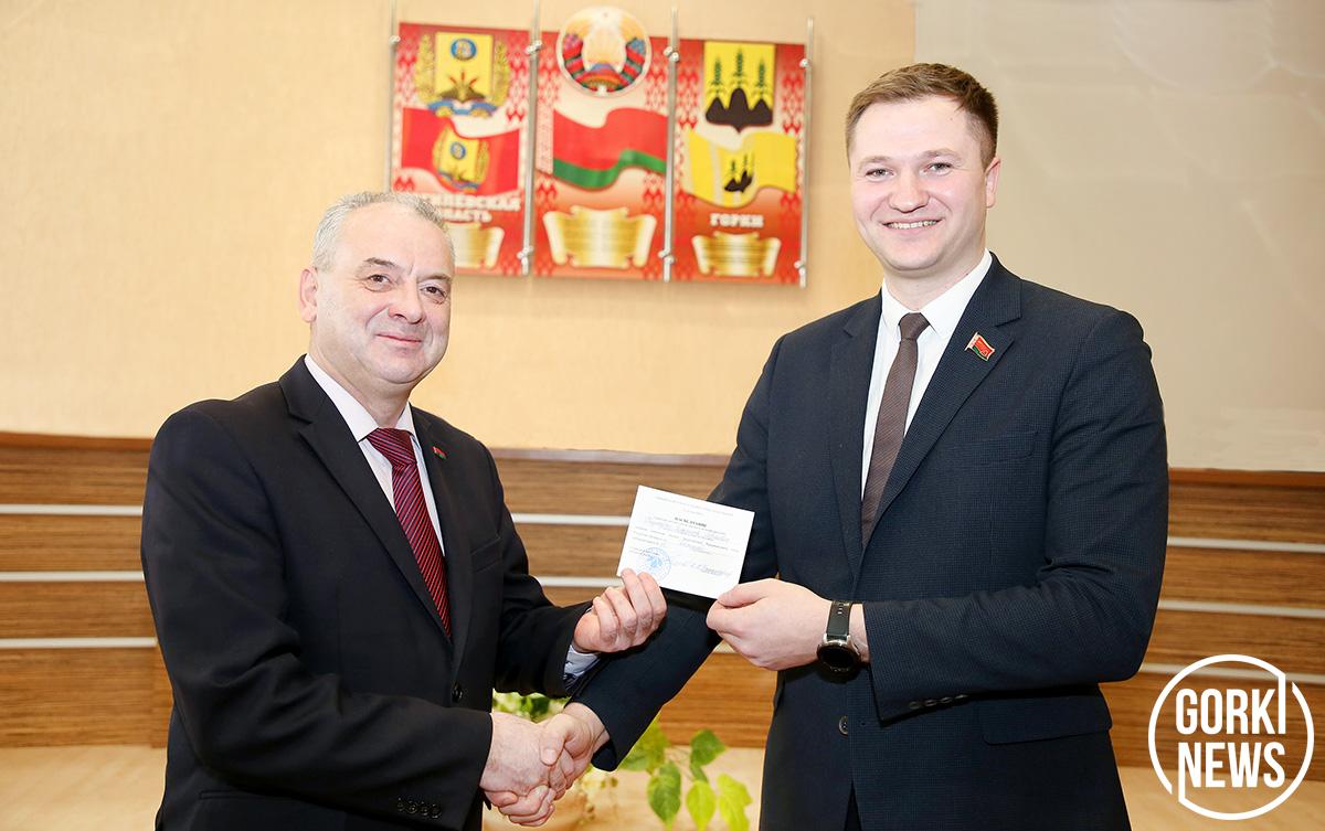 В Горках в торжественной обстановке с участием главы района Михаила Гулого председатель окружной избирательной комиссий Горецкого избирательного округа № 82 Андрей Пономарев вручил удостоверения депутата Палаты представителей Национального собрания Республики Беларусь Владимиру Павловскому и депутатам Могилевского областного Совета депутатов, куда от нашего округа избраны Владимир Королев и Наталья Глушакова