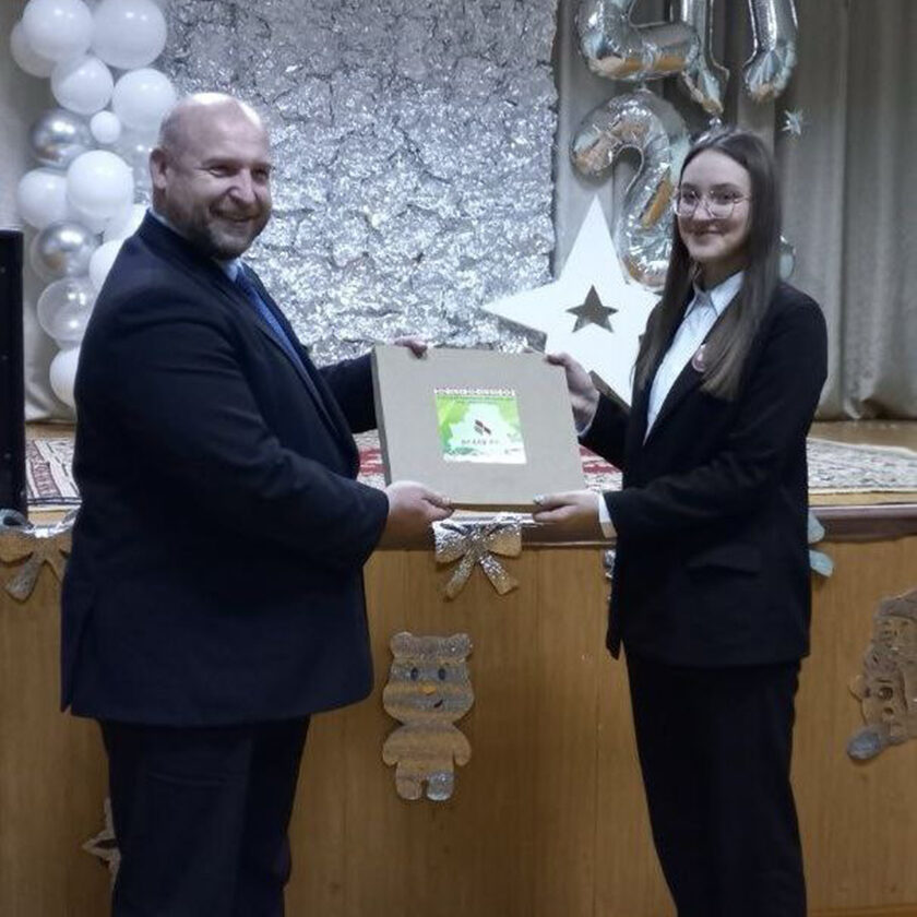 Максим Валентинович обратился к школьникам, педагогам и родителям с добрыми новогодними пожеланиями и вручил настольную развивающую игру для школы.