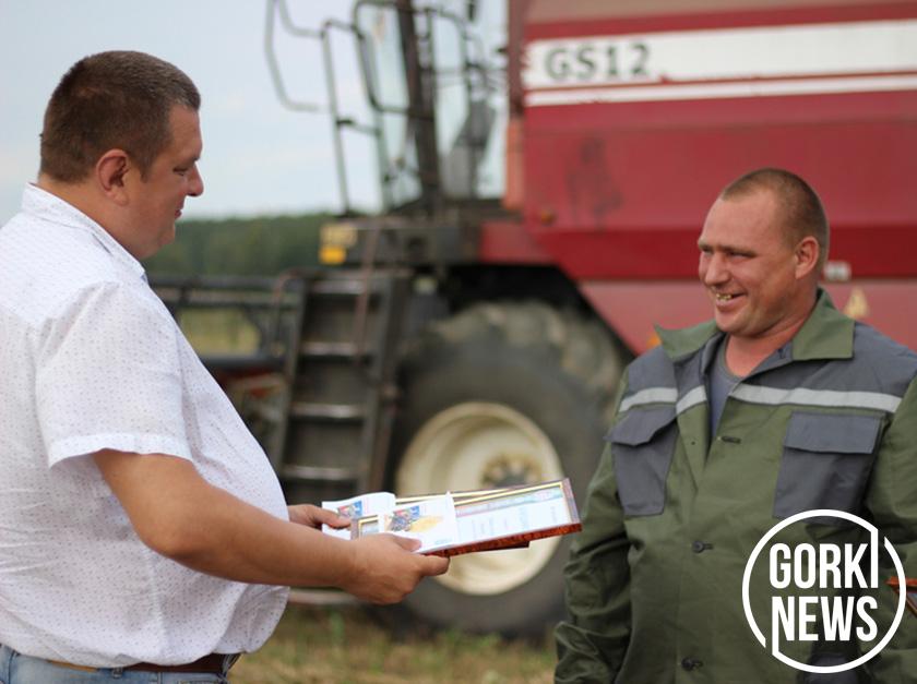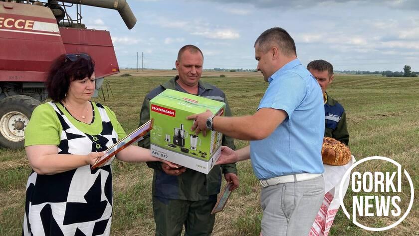 Андрей Саланинка вручил старшему комбайнеру Валерию Циркунову Благодарность райисполкома и кухонный комбайн от РК профсоюза работников АПК. Председатель РК профсоюза работников АПК Елена Чаплыгина вручила комбайнерам-рекордсменам каравай, профсоюзную символику и денежную премию помощнику комбайнера Анатолию Швайкову.