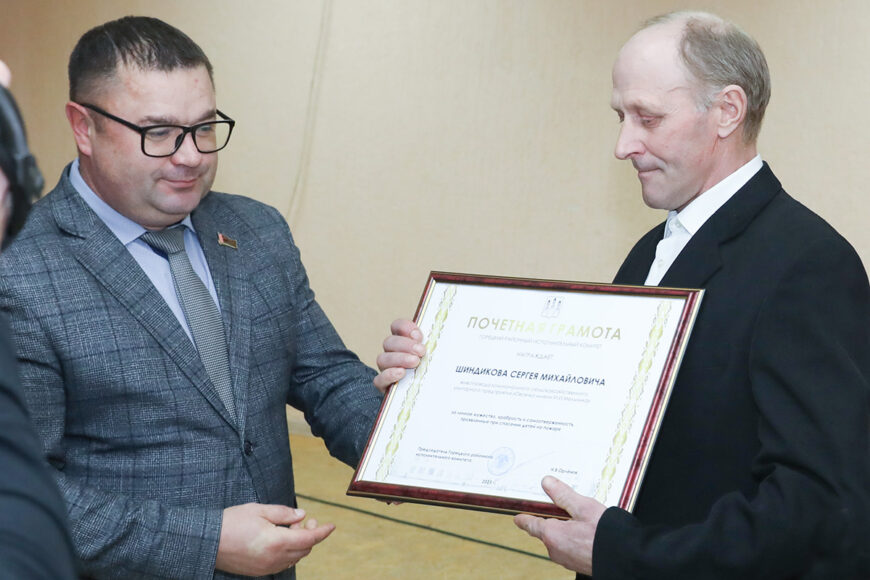 Заместитель председателя райисполкома Андрей Камко наградил 48-летнего животновода местного предприятия, многодетного отца Сергея Шиндикова Почетной грамотой Горецкого районного исполнительного комитета за личное мужество, храбрость и самоотверженность, проявленные при спасении детей на пожаре, а также ценным подарком.