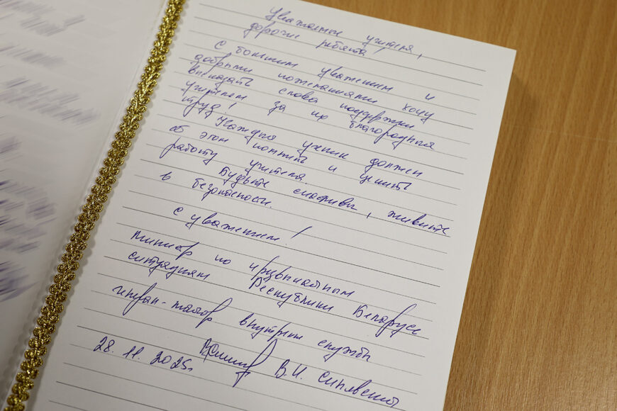 Вадим Синявский после церемонии награждения совершил экскурсию по школе, посетил бассейн, а затем оставил запись в «Книге почетных гостей» школы. Министр по ЧС пожелал педагогам и ученикам жить счастливо и в безопасности.