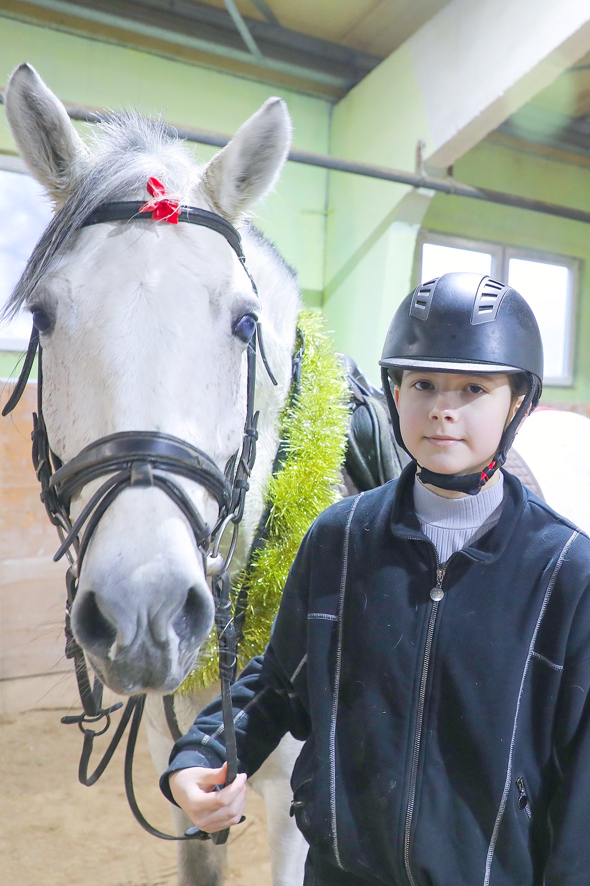 Один из таких партнеров – настоящий красавец, породистый жеребец Магеллан, на котором в день нашего приезда тренировалась восьмиклассница СШ № 2 Валентина Понталева. Он спокойно попозировал во время фотосессии, однако упорно уклонился от всяческой попытки кого бы то ни было накинуть на себя новогоднее украшение. Сразу видно, что жеребец с характером. То ли дело белая небольшая лошадка Карамелька, которую держала за поводья семиклассница СШ № 2 Ксения Деменкова. Она безропотно позволила набросить на себя гирлянду, продемонстрировав покладистый характер.