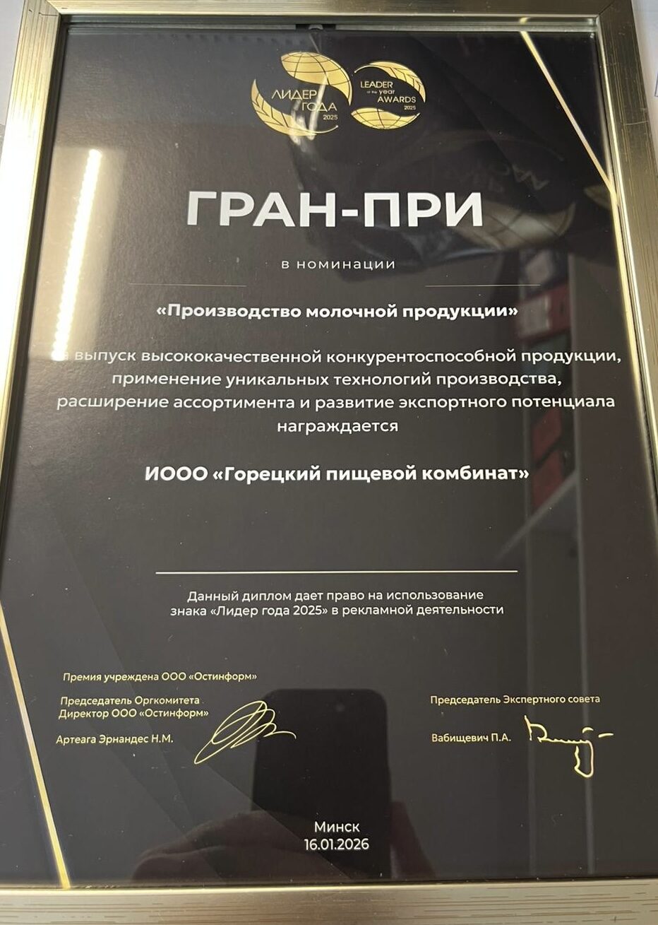 Высокая награда присуждена за выпуск высококачественной конкурентоспособной продукции, применение уникальных технологий производства, постоянное расширение ассортимента и развитие экспортного потенциала предприятия. Грамоту Гран‑при вручили директору ИООО «Горецкий пищевой комбинат» Евгению Гасанову.