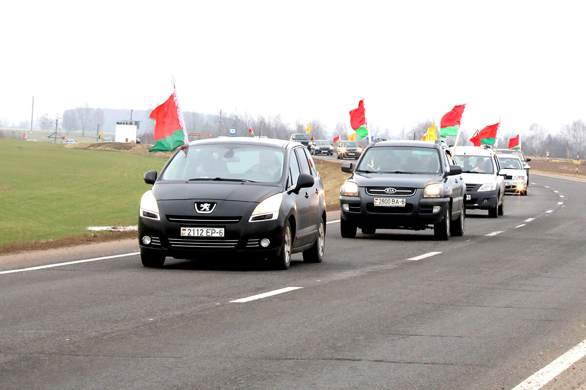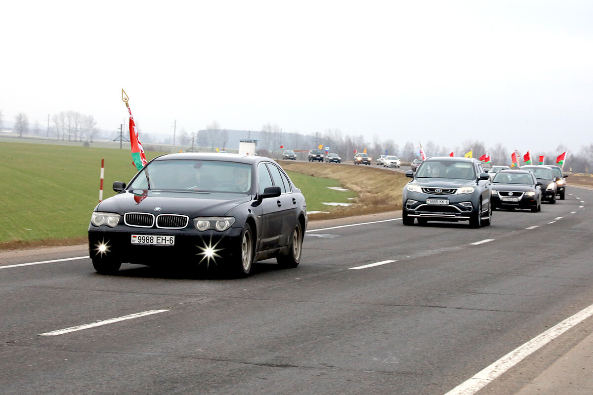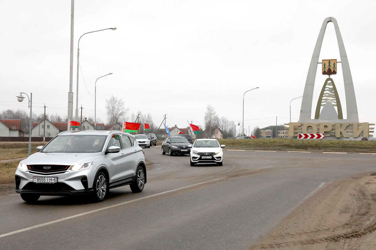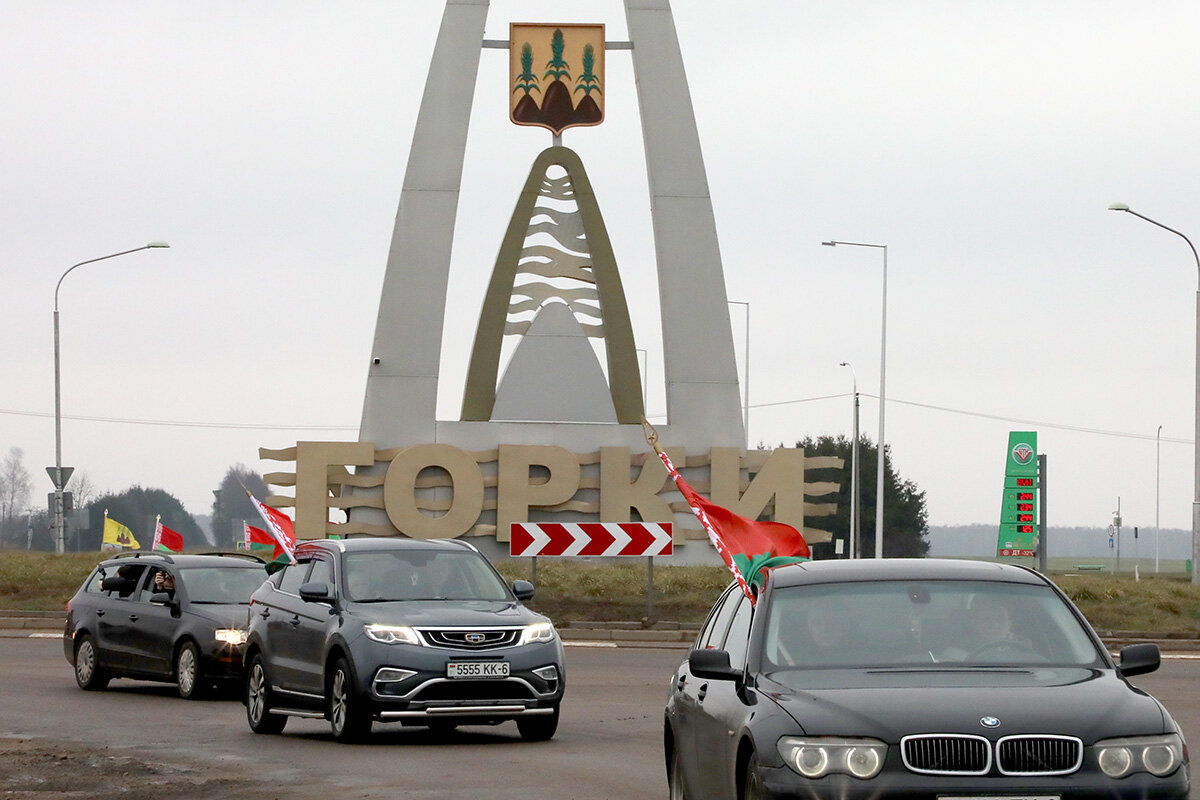 В полдень жители Горок присоединились к автопробегу в поддержку Александра Григорьевича. Колонна из 50 машин, украшенных государственной символикой, проехала по улицам города и направилась в агрогородок Овсянка.