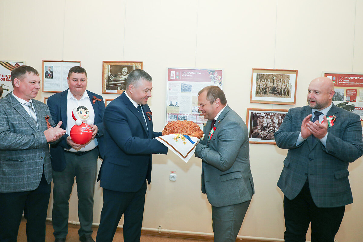 В приветственными словами к участникам мероприятия обратились руководители наших двух братских районов Максим Харников и Михаил Гулый. Они обменялись сувенирами в знак дружбы между нашими двумя городами-побратимами. Максим Викторович в знак уважения преподнес яблочный каравай и сувенирную куклу-неваляшку с символикой Великой Победы. Он отметили вклад своих земляков в Победу, ведь Тамбовская область, и город Мичуринск в том числе, была прифронтовой зоной. Он акцентировал внимание на том, что мы не должны забывать историю Великой Отечественной войны, какой ценой был завоеван мир. Михаил Владимирович поблагодарил Максима Викторовича за предоставленную выставку, которая будет очень познавательна для молодежи города и района и передал коллеге из Мичуринска «Книгу Память. Горецкий район» и соломенную куклу.