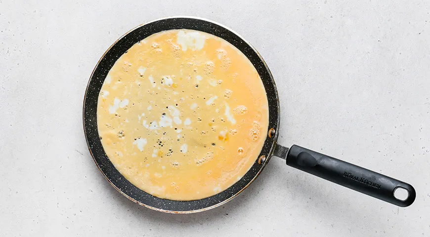 Влейте половину яичной массы и покачайте сковороду из стороны в сторону, чтобы получился тонкий блинчик. Жарьте на маленьком огне около двух минут. Края должны схватиться, а серединка может остаться жидковатой.