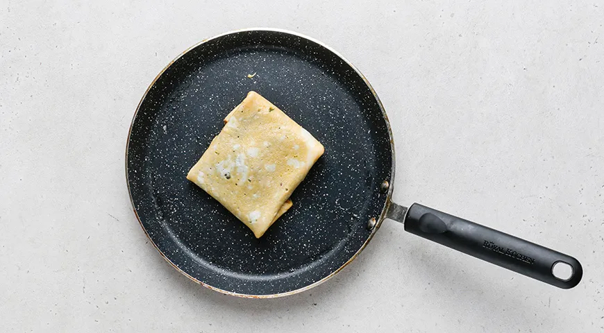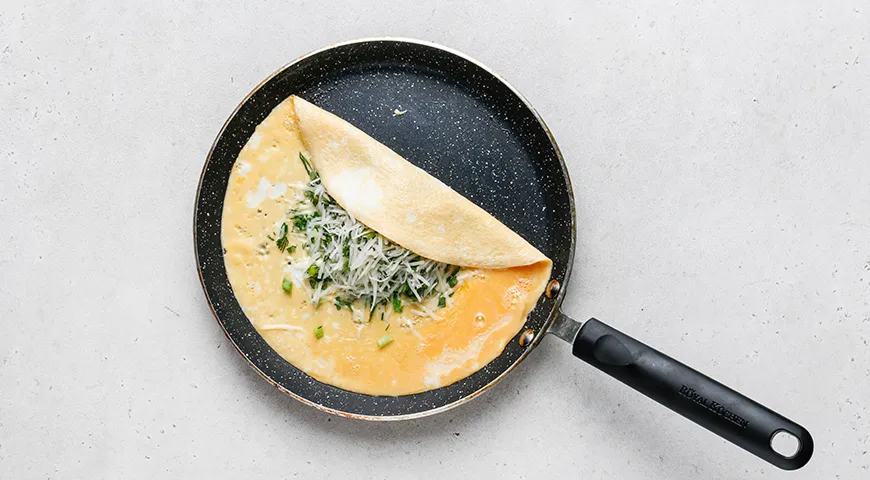 Насыпьте на середину блинчика половину сыра с зеленью. Готовьте около минуты. Сыр начнет плавиться. С помощью лопатки сложите края блинчика с двух сторон навстречу друг другу.