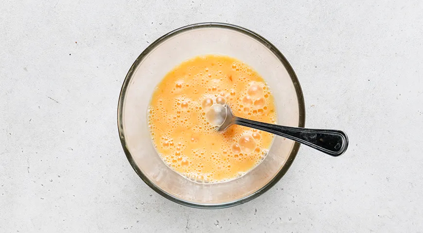 Вбейте яйца во вместительную миску. Немного посолите и поперчите. Взболтайте вилкой или венчиком, но только чтобы желтки и белки смешались. Пышность в данном случае не нужна.