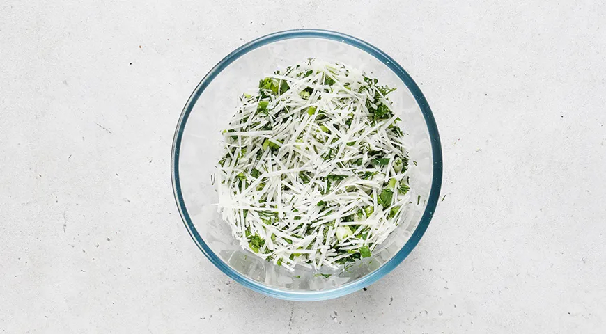 Натрите сыр на крупной терке. Перемешайте с зеленью. Поставьте на плиту сковороду диаметром около 26 см. Влейте немного масла. Нагрейте на небольшом огне.