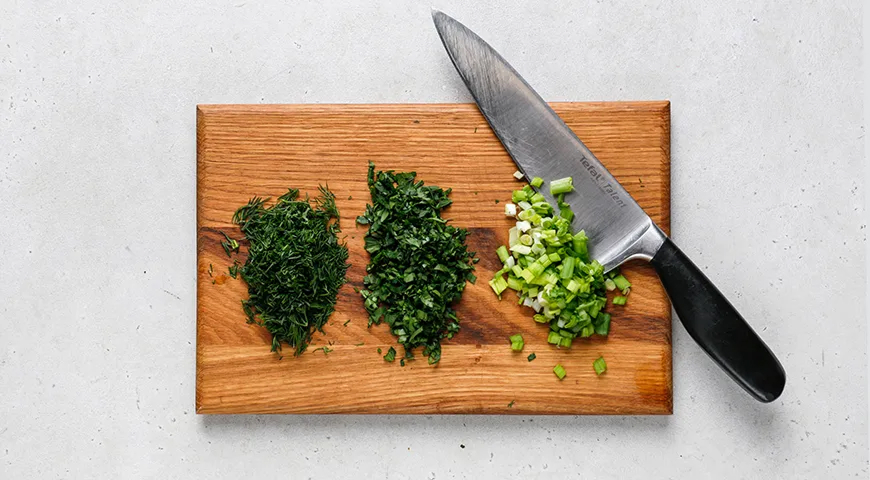 Оборвите с укропа и петрушки тонкие веточки с листочками. Мелко порубите. Нарежьте лук колечками. Соедините с петрушкой и укропом. Треть отложите для подачи конвертиков.