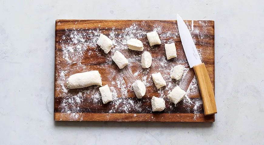 Раскатайте каждую часть в тонкий жгутик. Нарежьте его маленькими кусочками и уложите на доску, выстланную бумагой для выпечки. Так же приготовьте заготовки для вареников из оставшегося теста. Уберите в морозильную камеру на 30 минут.