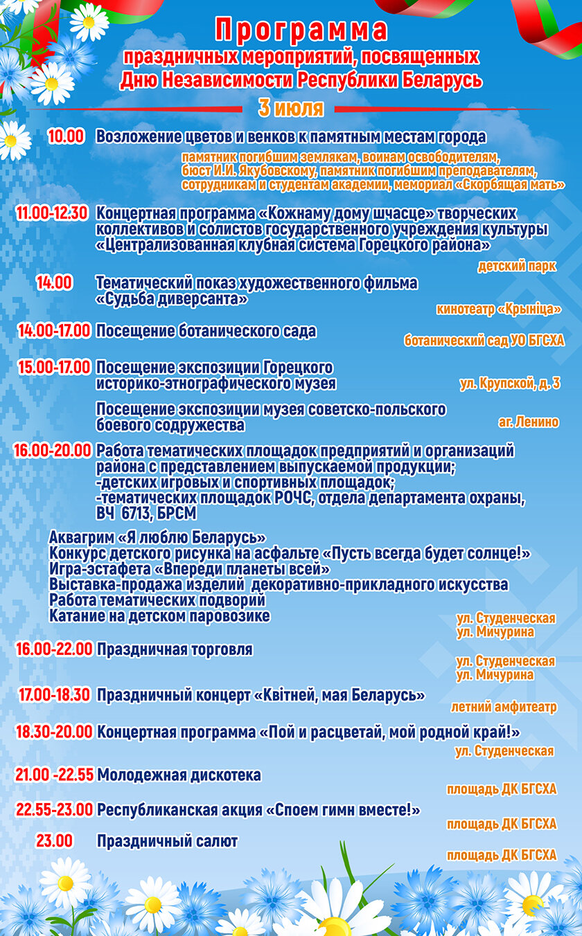 Как Горки будут праздновать День Независимости: программа мероприятий Gorkinews 29 июня 2023 13:30 Теги День Независимостипопулярпрограмма Предыдущая новость Следующая новость Поздравление от районной власти с Днем экономиста Передовики на заготовке кормов