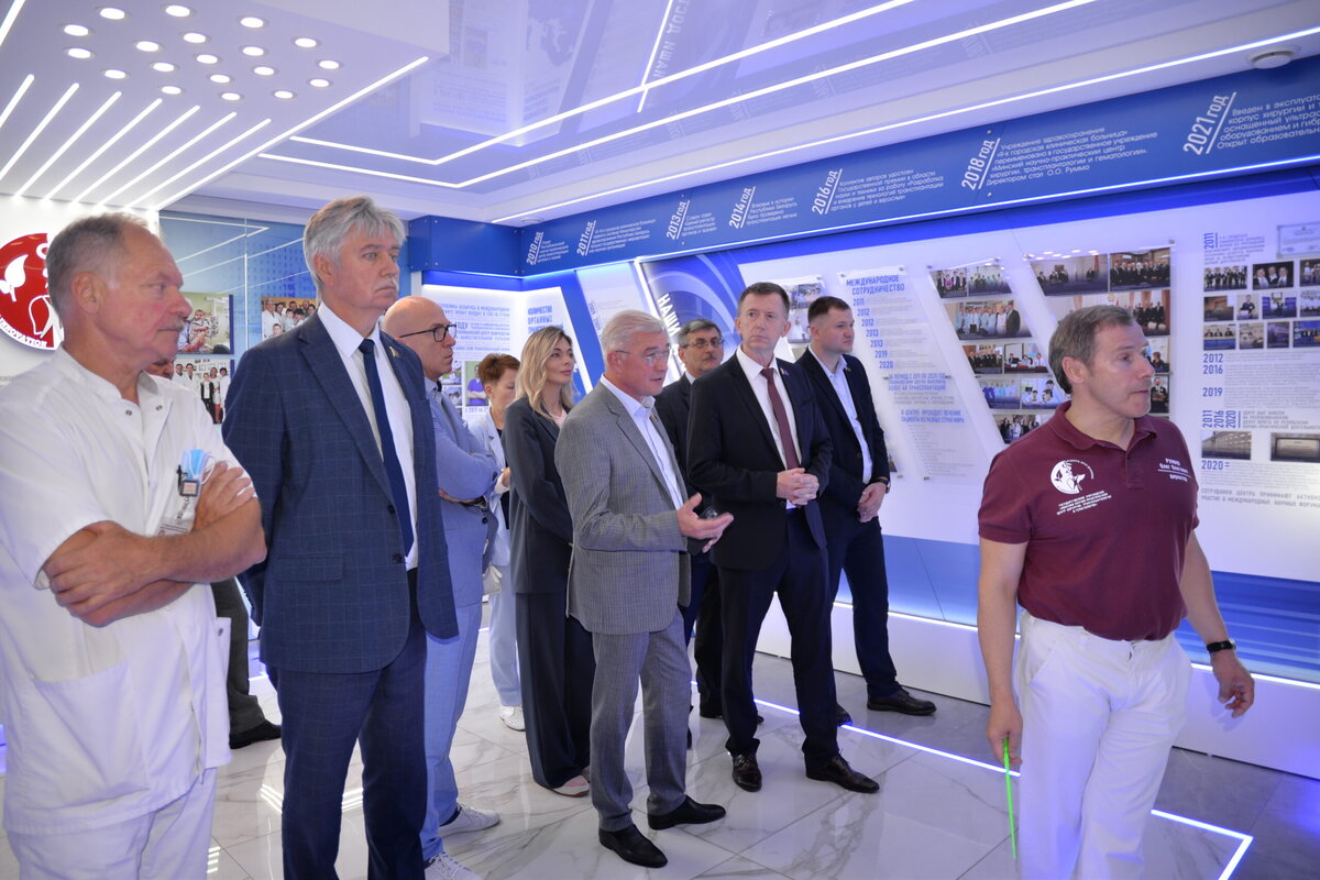 Директор Олег Руммо провел для депутатов экскурсию по центру, познакомил с возможностями нового корпуса гематологии и трансплантации костного мозга, а также с историей, экспозицией, операционными и образовательным центром.
