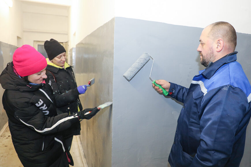 Отдельный фронт работ – шефская помощь СЗАО «Горы» со стороны работников райисполкома, центра по обеспечению деятельности бюджетных организаций, ДЮСШ, ОАО «Према» и других закрепленных организаций. Сейчас их усилия сосредоточены на  реконструкции молочнотоварного комплекса «Горы» на 2000 голов, открытие которого запланировано на 23 декабря. В день нашего приезда там работали специалисты центра по обеспечению деятельности бюджетных организаций. По словам главного экономиста СЗАО «Горы» Татьяны Савченко, городские помощники помогают сделать последние штрихи перед открытием МТК: уборка, покраска, вывоз остатков стройматериалов и мусора, приведение территории в порядок. «Мы попросили помощи, чтобы открыть комплекс в установленные сроки. Хорошо работают наши городские помощники. По каким вопросам ни обратимся, всегда идут навстречу и все делают», – подчерки­вает Татьяна Василье­вна.