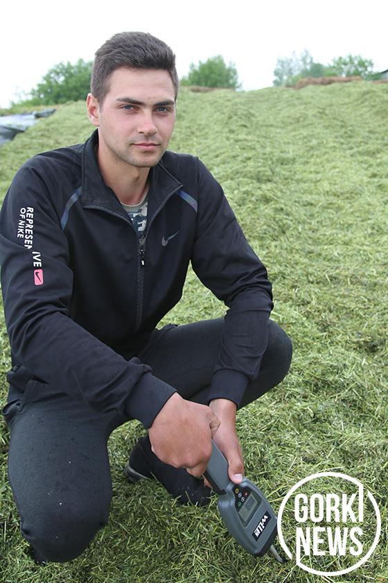 Качественно подбирает в валок и измельчает зеленую массу на КВК-800 механизатор Николай Деменков, который встречает в поле 21-ю косовицу. После прохода его агрегата на участке не остается неубранного травостоя. В день нашего приезда на косовице трудился один мехотряд. На следующий день приступал к работе второй. Всего задействовано 17 единиц техники. В том числе и новый мощный Беларус-3522, который на днях приобрели в лизинг. На всех энергонасыщенных тракторах установлена GPS-навигация, которая позволяет в режиме онлайн не только экономить топливо, но контролировать ночью работу техники на сенажных траншеях. Их в хозяйстве 14, вместимостью по 2 тыс. т. Недавно построили одну за бюджетные средства и планируют приступить к еще одной. В день нашего приезда тщательно осуществлял трамбовку сенажной массы на «Амкодоре» молодой и ответственный механизатор Александр Пусиков. «Делает свою работу на совесть. Неторопливо и уверенно «утюжит» сенажную траншею», — говорит Виктория Недбайло. Вся техника на траншее проходит через взвешивание на весах. Качество трамбовки каждые 2 часа проверяет с помощью нового влагомера молодой агроном Александр Рогонов, которыйраспределился в хозяйство год назад. Молодой семье с сыночком предоставили 3-комнатную квартиру.«Работать с таким прибором приятно. Он одновременно определяет и температуру, и влажность. Все здесь в норме: температура 30 °С, влажность 46%». Одну часть траншеи уже накрыли пленкой на случай дождя, чтобы исключить попадание влаги. Когда все делают по технологии, есть и результат. Вердикт кормовой лаборатории: сенаж в траншее первого класса.