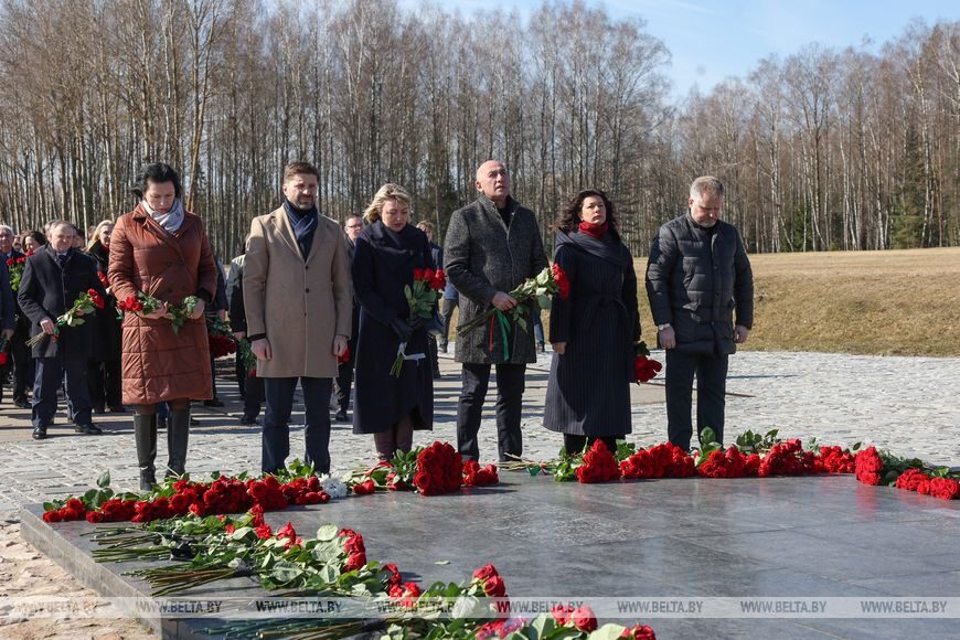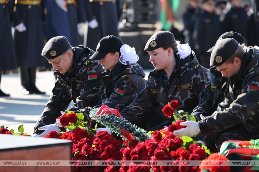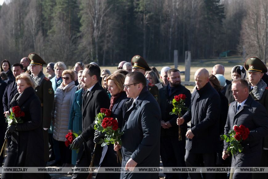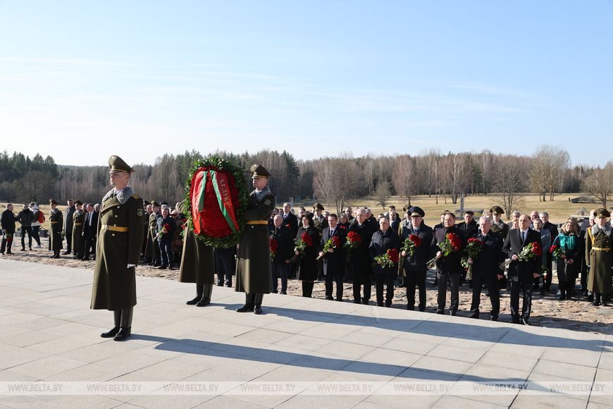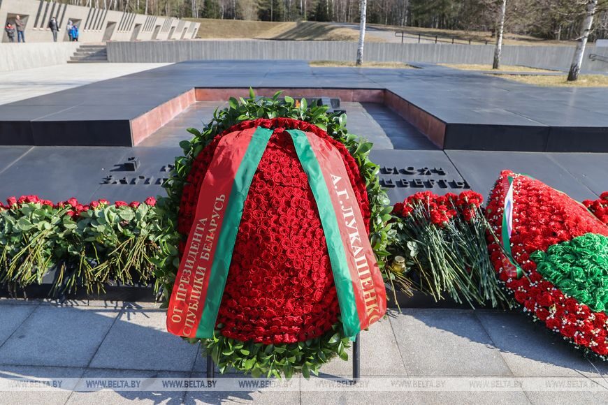 Первым к Вечному огню лег венок от Президента Республики Беларусь как символ того, что вся страна сегодня скорбит, вспоминая жителей Хатыни, а также жителей белорусских деревень, разделивших ее судьбу. Таких населенных пунктов 288, частично или полностью уничтоженных — более 12 тыс.