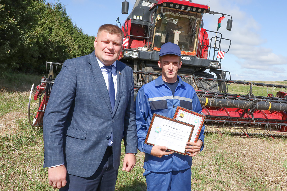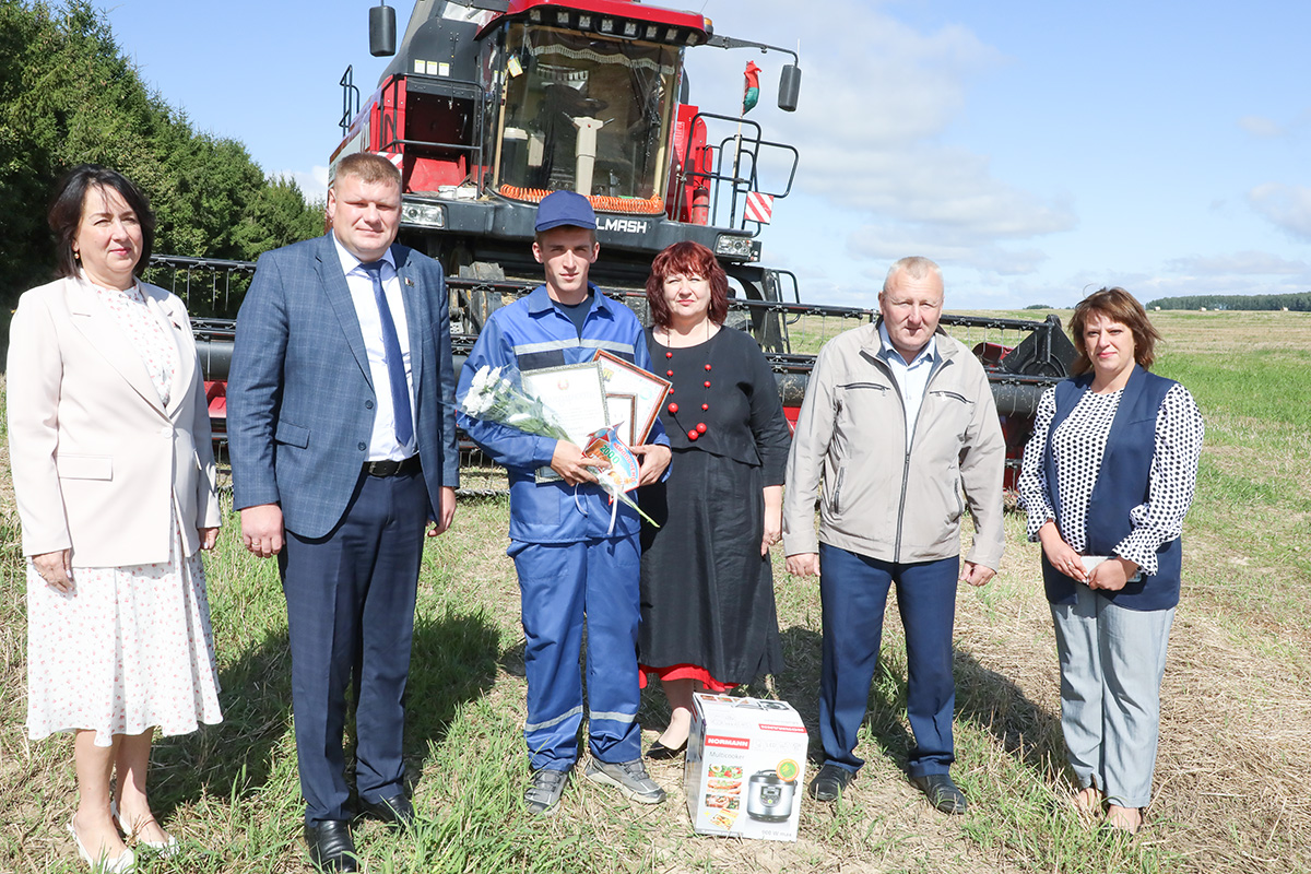 Сегодня утром на поле вблизи аг. Ректа молодого лидера уборочной страды торжественно чествовали: председатель районного исполнительного комитет Николай Орлёнок, управляющий делами райисполкома Наталья Ковалева, председатель райкома профсоюза работников АПК Елена Чаплыгина, директор ОАО «Горецкое» Владимир Черников и председатель профкома хозяйства Эмилия Купреева. Руководство района, сельхозпредприятия, профсоюзы вручили Андрею Бранцевичу достойные награды за самоотверженный труд и высокий результат.