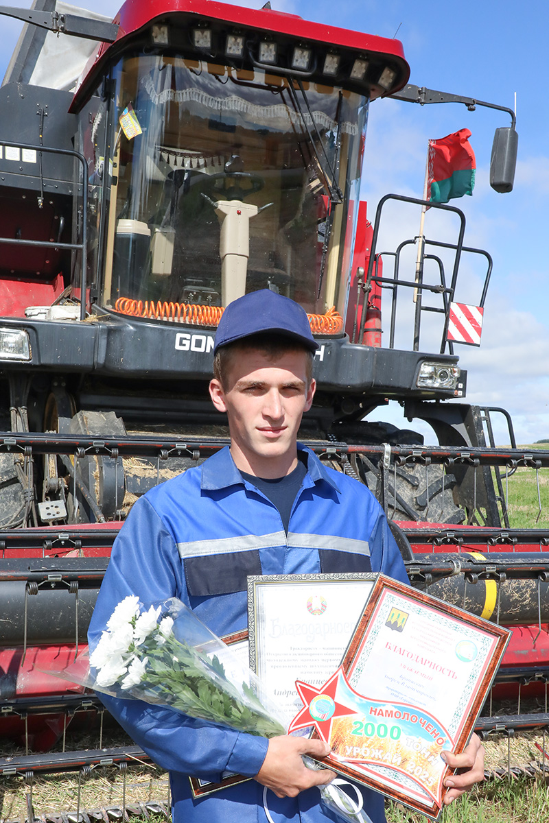 Буквально недавно, 5 августа, Андрея как лидера среди молодых на уборочной награждали за первую тысячу тонн зерна, выгруженного из бункера комбайна, и желали преодолеть новые рубежи. И вот трудолюбивый комбайнер достиг очередной зачетной отметки, принесшей в копилку его трудовых достижений 2000 тонн хлеба нового урожая. Парень удвоил свой первый рекорд, на который был нацелен с самого начала, а уверенности в своих возможностях придал двухтысячный результат молодежного экипажа из Кировского района, который первыми в Могилевской области покорил эту планку, и который Андрей, как и его коллеги из других районов, поздравил через Интернет.