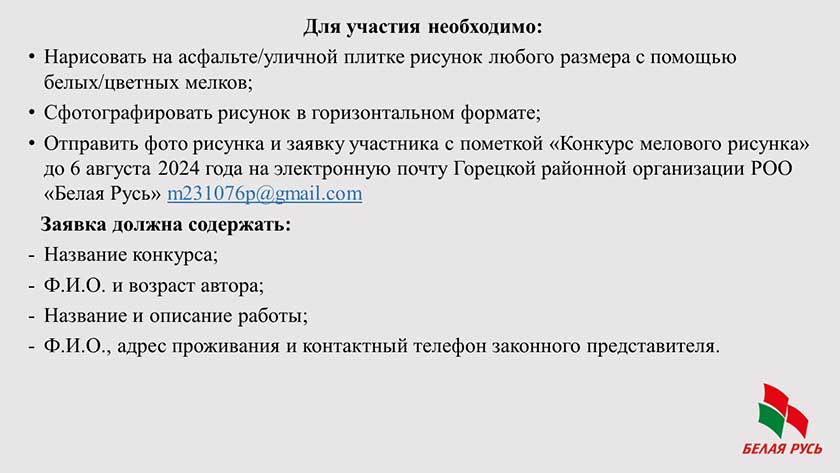 Конкурс детского мелового рисунка «Белая Русь глазами детей» проходит с 3 июля по 5 августа Gorkinews 18 июля 2024 6:55 Теги БеларусьГоркиконкурспопулярсоветуем Предыдущая новость Следующая новость В Беларуси установлено ограничение разницы в возрасте между отцом и ребенком при установлении отцовства Лукашенко назначил новых замминистра обороны и командующего на Северо-Западном направлении