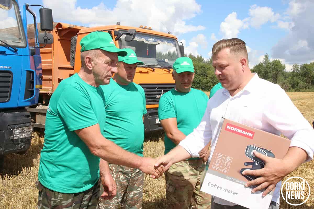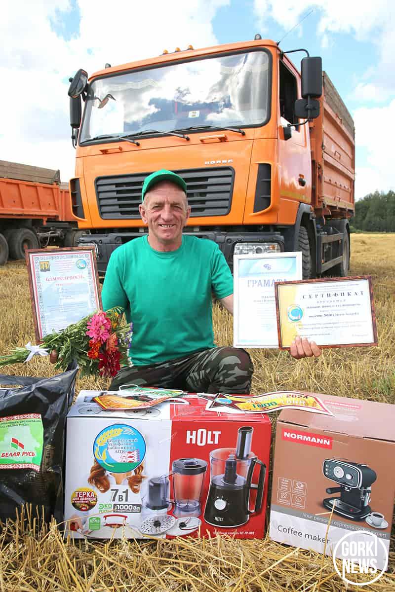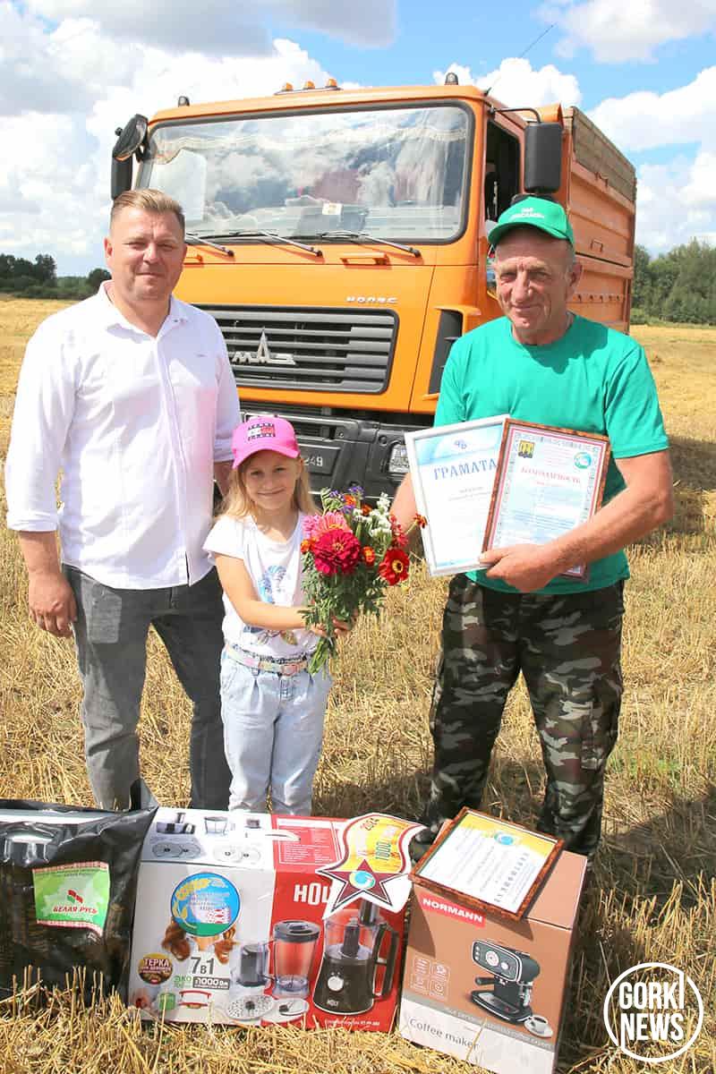 В минувший понедельник героя жатвы с трудовым рекордом чествовали председатель райисполкома Михаил Гулый, председатель районного Совета депутатов и РО РОО «Белая Русь» Максим Потапенко, председатель районного объединения профсоюзов Марина Бандык, председатель РК профсоюза работников АПК Елена Чаплыгина, директор хозяйства Владимир Павлов, коллектив ОАО «Молочные горки», где сельхозпредприятие находится в доверительном управлении. Герой дня сегодня собрал настоящую коллекцию бытовой техники, ценных подарков и премиальных бонусов.