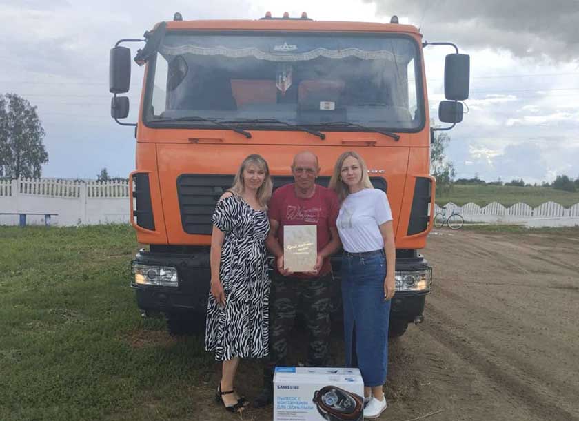 Председатель районного объединения профсоюзов Марина Бандык отметила высокий профессионализм водителя и его ответственность, благодаря чему и был достигнут успех. Председатель РК профсоюза работников АПК Елена Чаплыгина пожелала передовику сил, вдохновения и скорейшего покорения очередного рубежа – 2-тысячной отметки на перевозке зерна. Лидеры общественной организации вручили водителю Диплом, профсоюзную символику на машину, которая будет отличать героя жатвы, и весомые денежные премии.