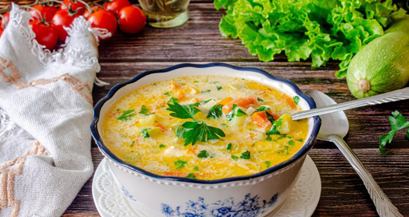 1. Бульон довести до кипения. Положить нарезанный картофель. Кабачок нарезать кубиками. Лук, морковь очистить, мелко нарезать и спассеровать.