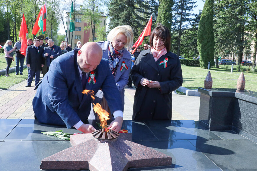 Участники пробега взяли частички вечного огня от мемориала «Скорбящая мать», чтобы довезти их к местам захоронений советских воинов и погибших земляков на территории Горецкого района.