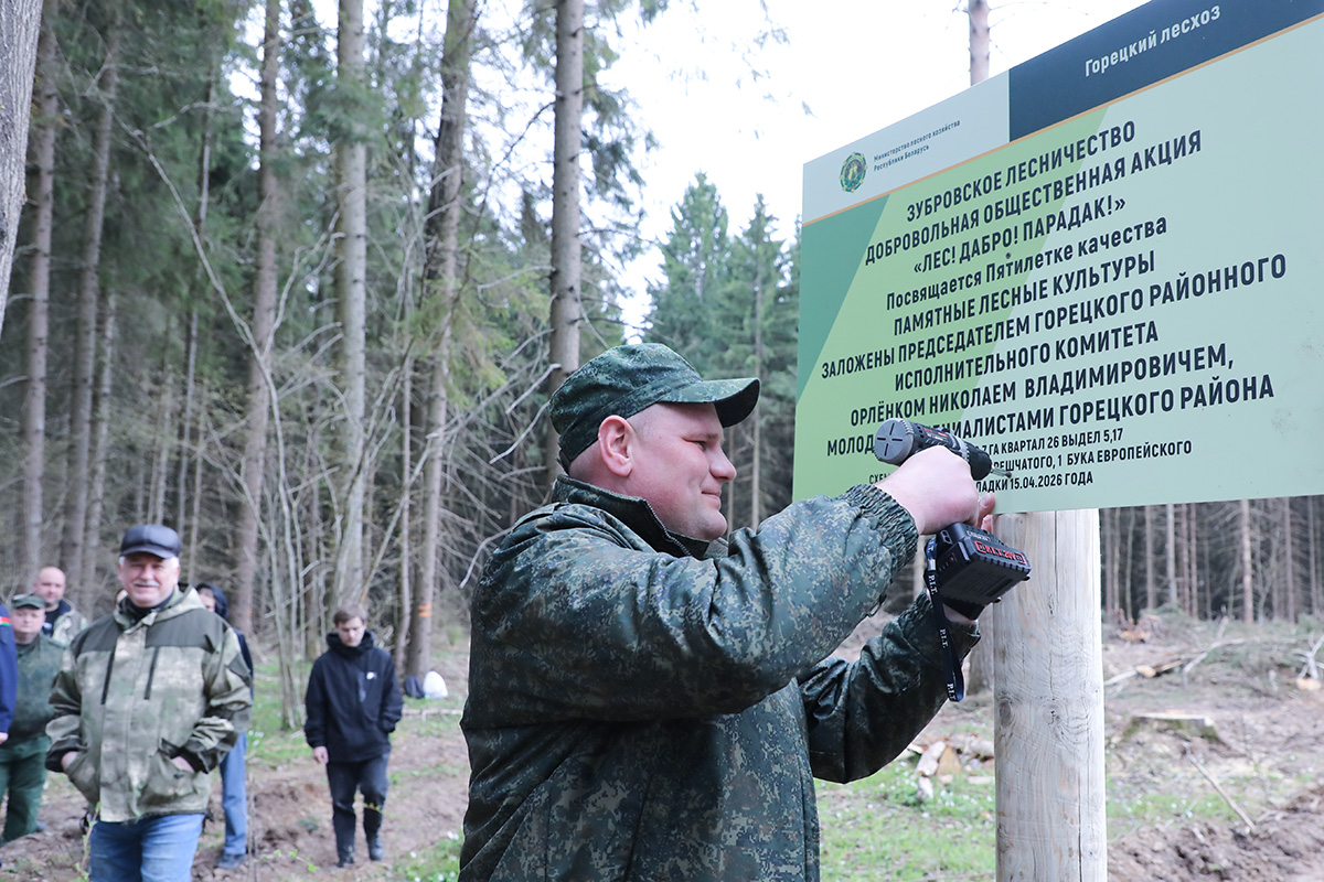 Когда помощь лесу была оказана, председатель районного исполнительного комитета Николай Орлёнок прикрутил табличку о проделанной работе по созданию памятных лесных культур.