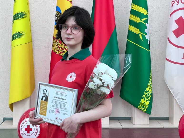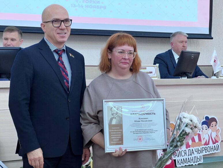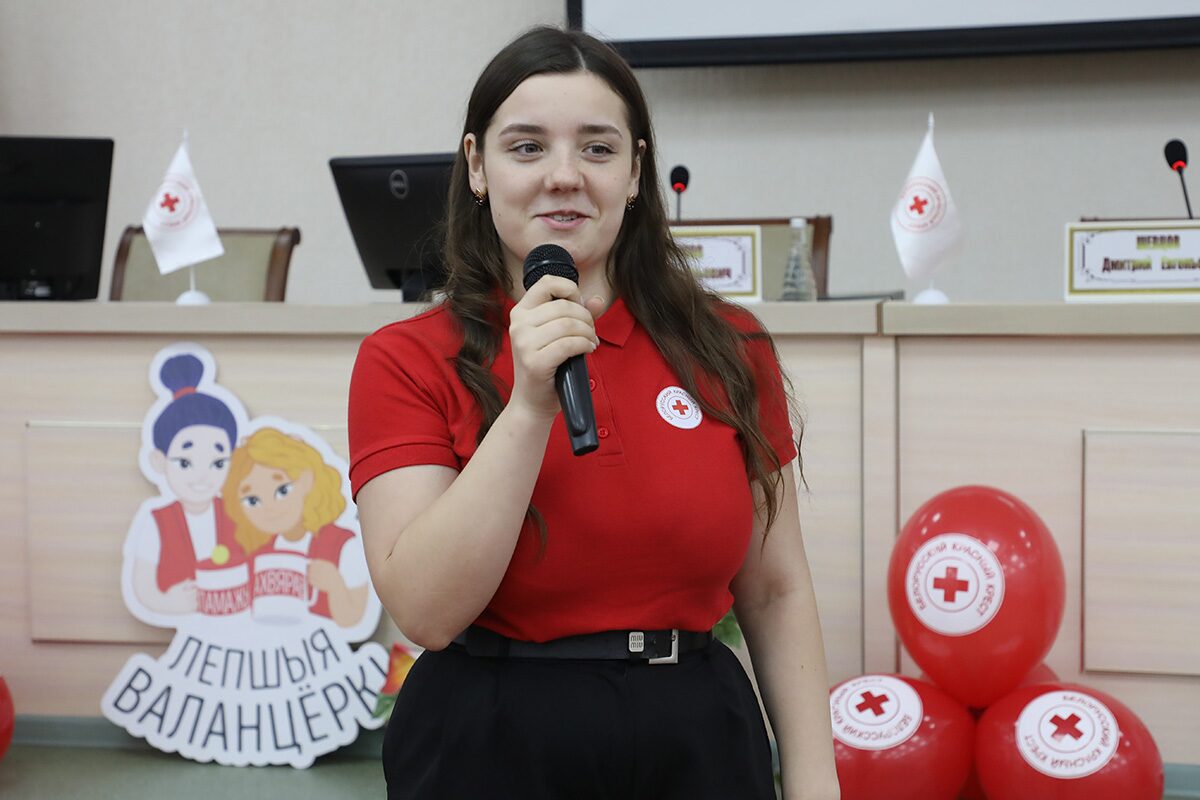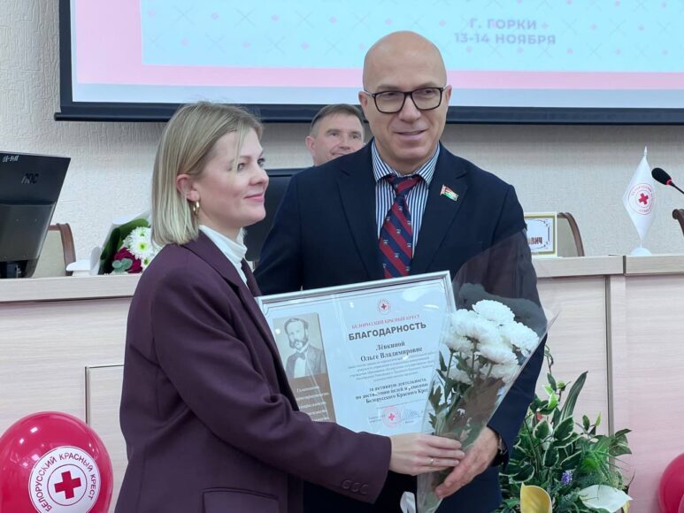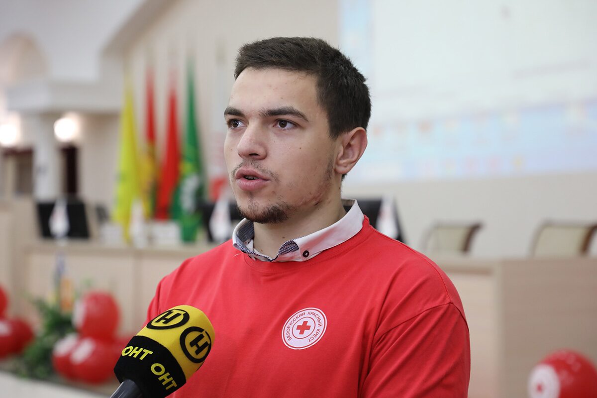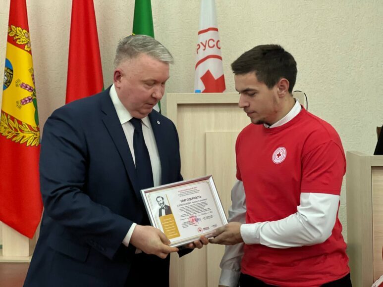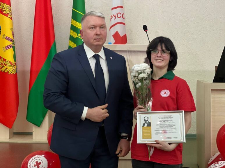 Председатель Могилевской областной организации Белорусского Красного Креста Андрей Мартыновский, также провел церемонию награждения, отметил руководителя студенческого клуба по международному гуманитарному праву «Послы мира» Полину Михеенко и активных волонтеров Артема Житковского и Полину Кононович.