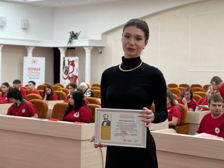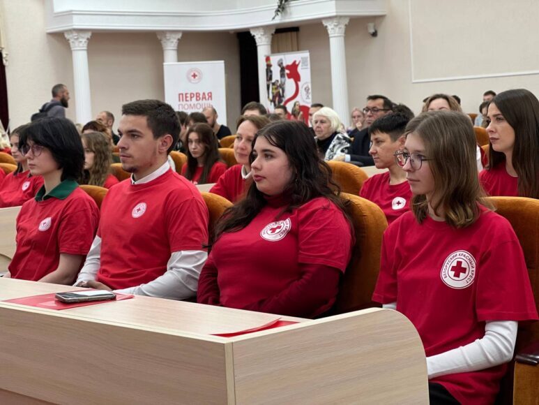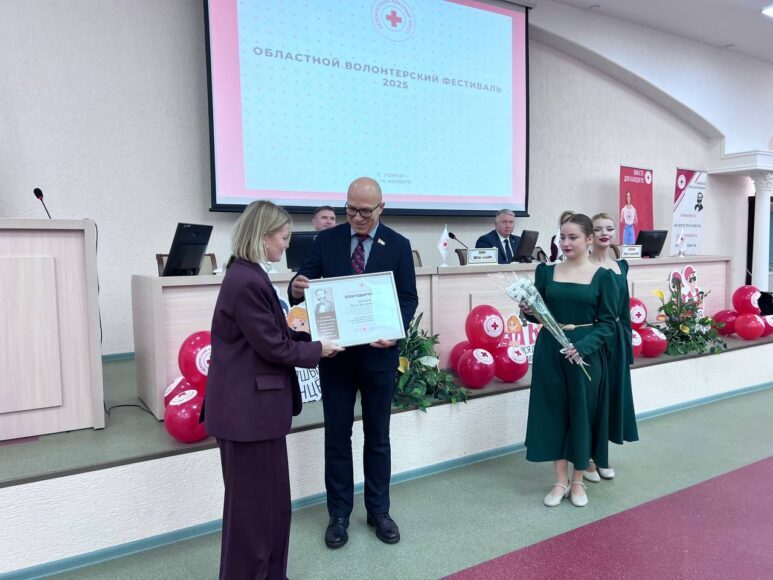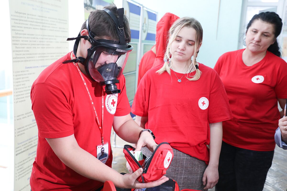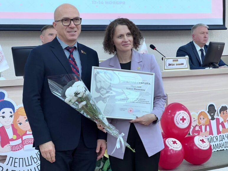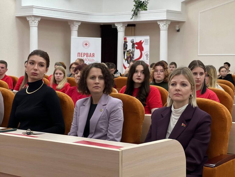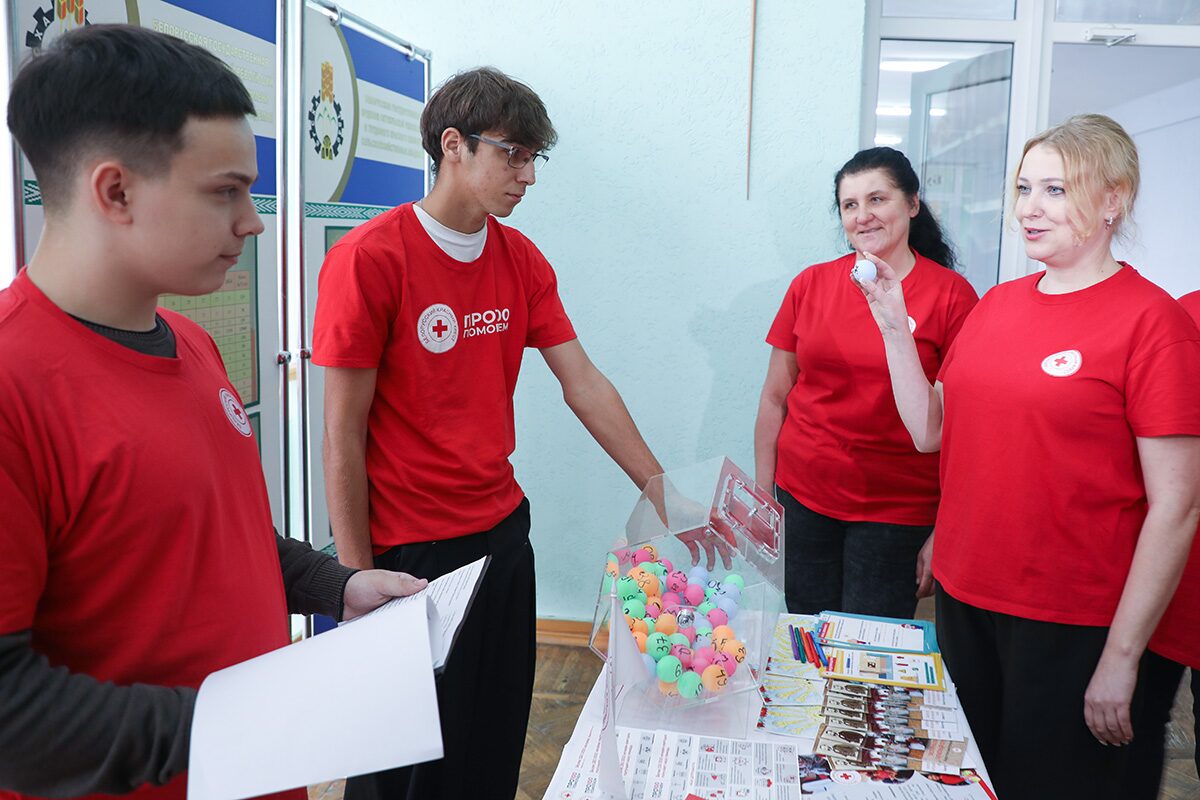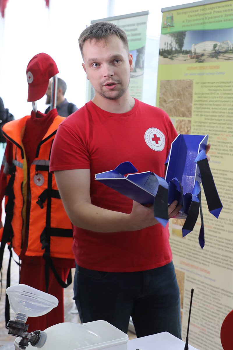 Председатель Могилевской областной организации Белорусского Красного Креста Андрей Мартыновский, также провел церемонию награждения, отметил руководителя студенческого клуба по международному гуманитарному праву «Послы мира» Полину Михеенко и активных волонтеров Артема Житковского и Полину Кононович.