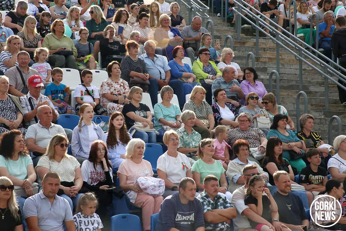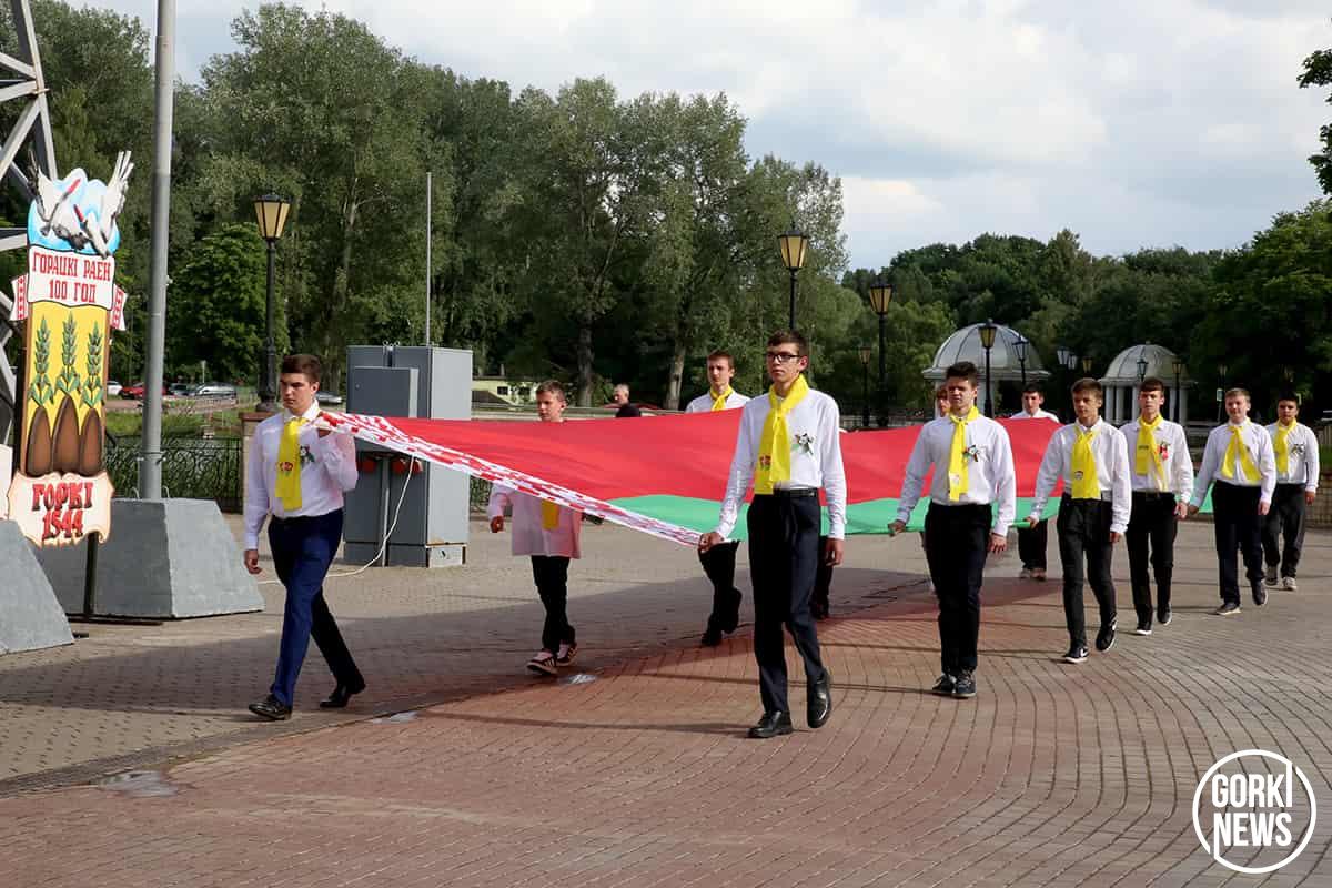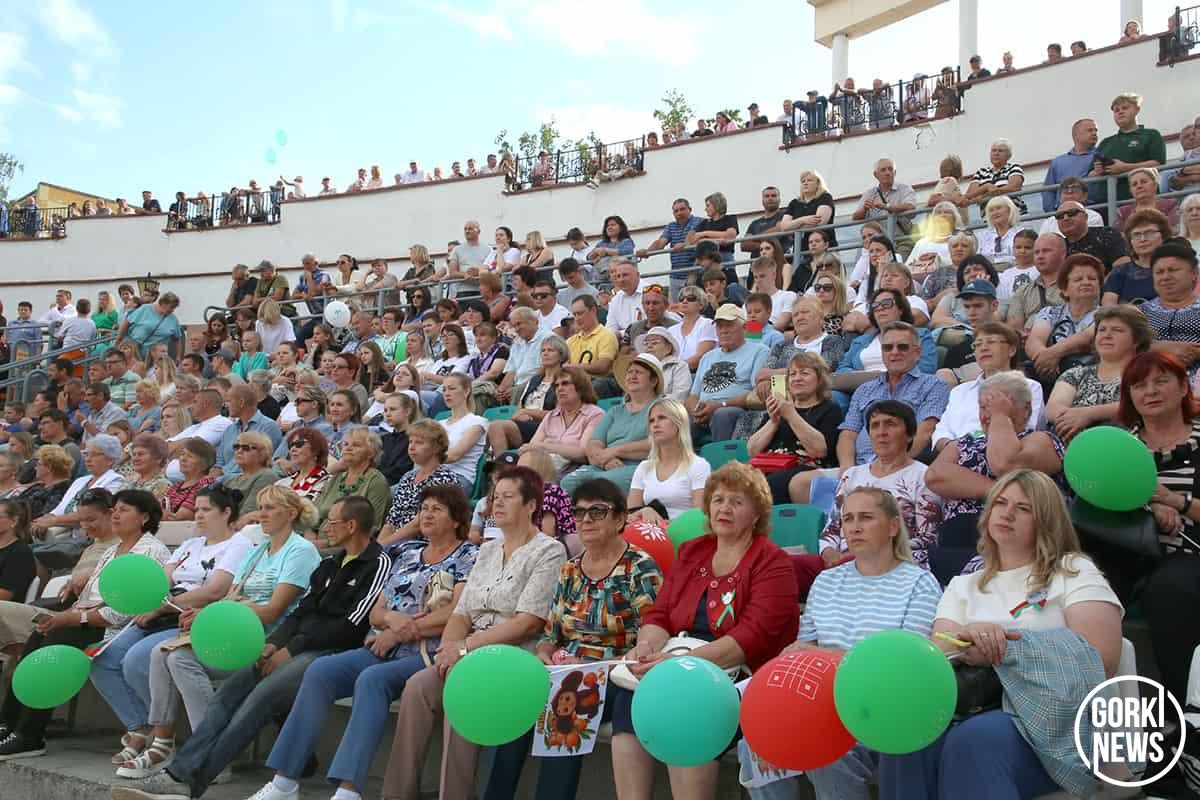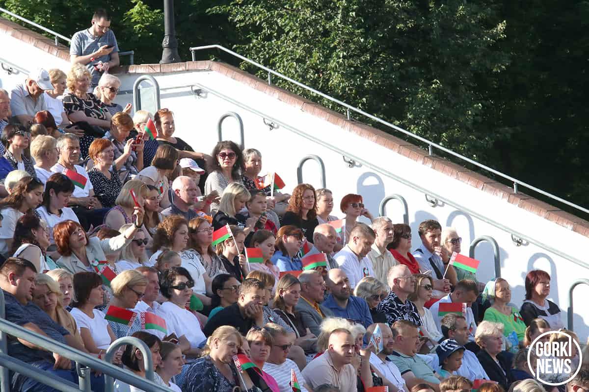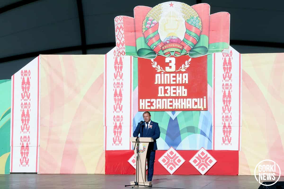После торжественного выноса огромного полота Государственного флага Республики Беларусь и исполнения Государственного гимна Республики Беларусь, который стоя пел весь зал, слово было предоставлено председателю райисполкома. Глава района Михаил Гулый искренне приветствовал жителей и гостей праздника и поздравил с Днем Независимости Республики Беларусь и 80-й годовщиной освобождения Беларуси от немецко-фашистских захватчиков всех собравшихся в зрительном зале летнего амфитеатра.