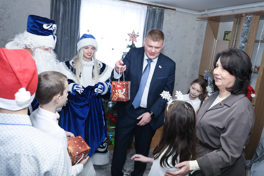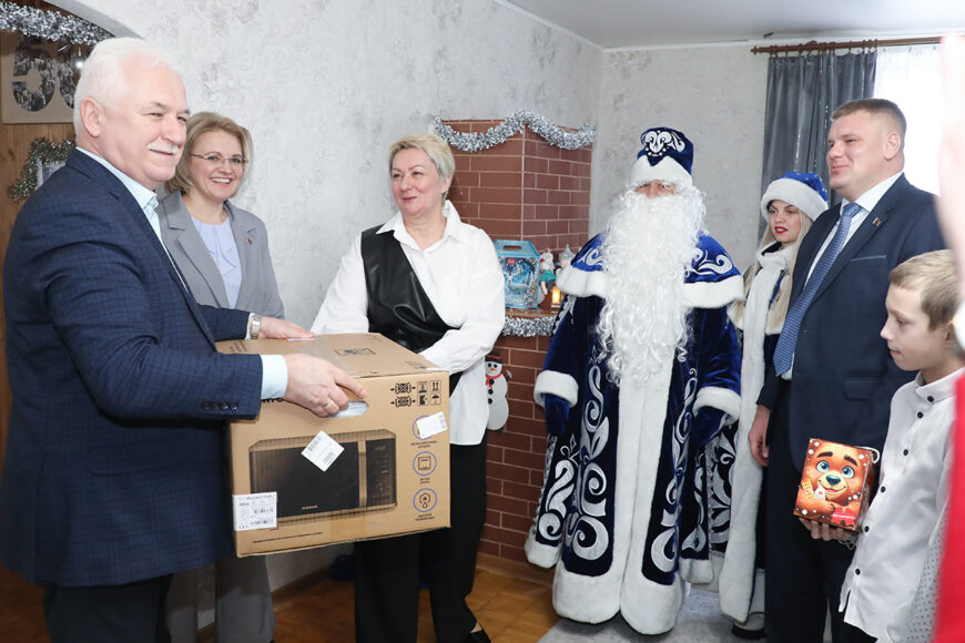 Председатель райисполкома вместе с Дедом Морозом поздравили ребят и вручили сладкие подарки, а семье — нужный в быту подарок: микроволновую печь.