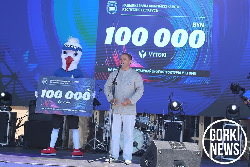 НОК Беларуси выделил 100 тысяч рублей на развитие спорта городу Горки. В Торжественной обстановке соответствующий сертификат в рамках официальной церемонии открытия фестиваля председателю райисполкома Михаилу Гулому вручил Президент олимпийского комитета Виктор Лукашенко. Виктор Александрович выразил уверенность, что выделенные средства помогут значительно укрепить спортивную инфраструктуру города.
