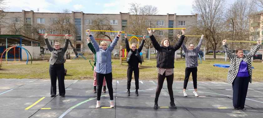 Погода способствовала оздоровлению сотрудников, которые с удовольствием собрались на физкультурной площадке, чтобы разучить и выполнить оздоровительный комплекс с гимнастическими палками, укрепить мышцы спины и сделать стройным своё тело.