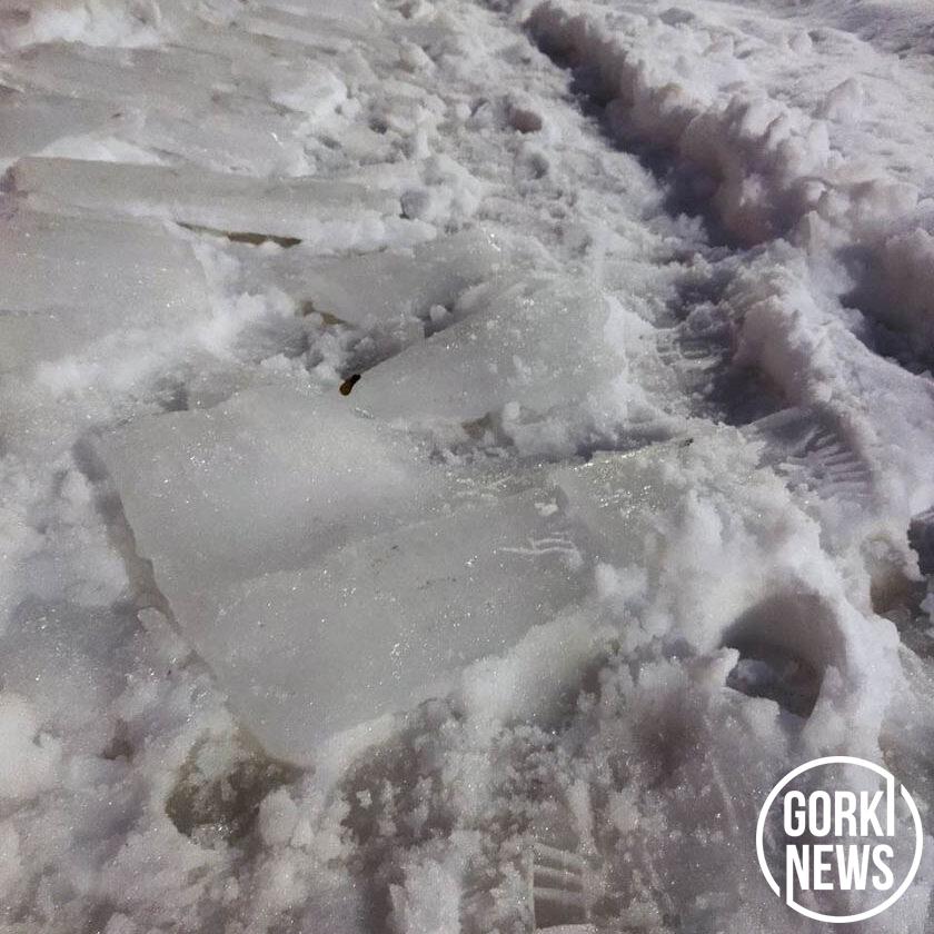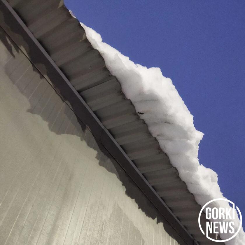 Плюсовая температура после обильных снегопадов дает о себе знать — образовался гололед и начали таять наметы на крышах.