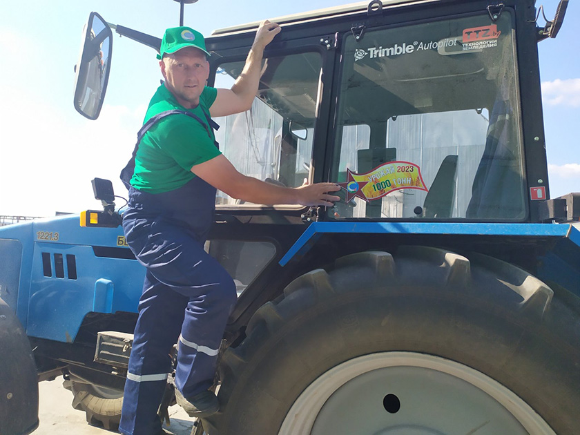Первый тысячник на отвозке зерна нового урожая в ГСХУ «Сортоиспытательная станция» Сергей Кубышкин преодолел значимый рубеж на тракторе МТЗ-1221 с прицепом. В нем помещается 12 т. Наш герой ежедневно доставлял от комбайнов по 75-80 т зерна. Он второй год работает в этой сельхозорганизации. Раньше был рабочим в льносемстанции. Начинал работать на стареньком тракторе, а весной доверили ключи от нового с системой автопилотирования, позволяющей экономить ресурсы.