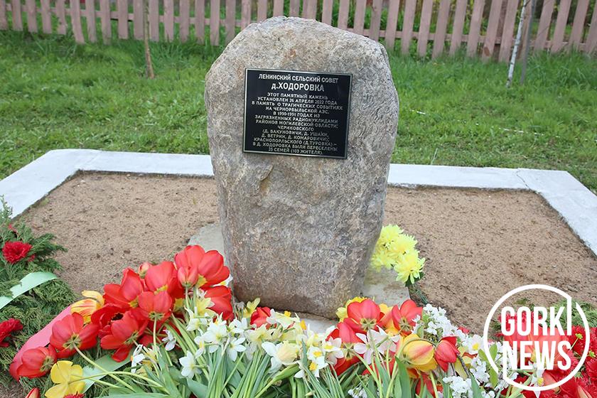 На памятном знаке, установленном в 2022 г., указано, что в 1990-1991 годах из загрязненных радионуклидами районов Могилевской области, Чериковского и Краснопольского, в д. Ходоровку были переселены 25 семей.