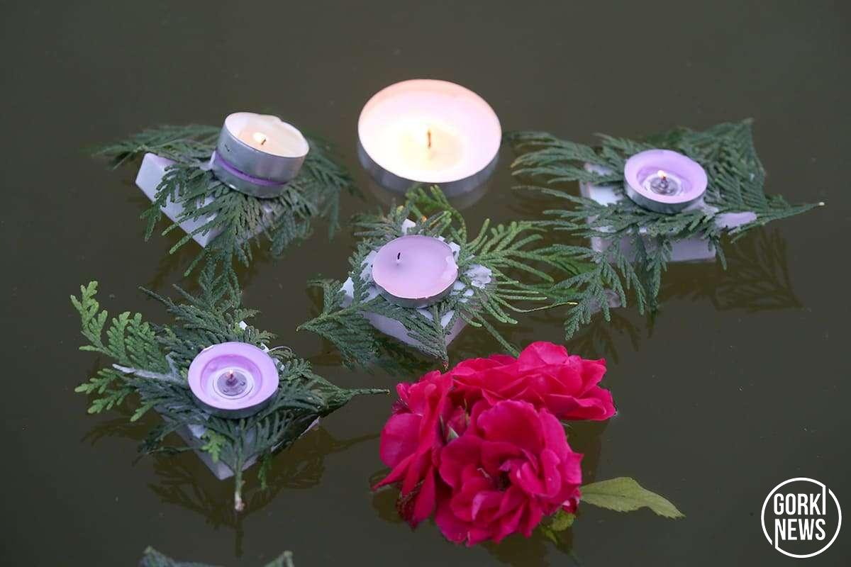 Участники акции «Звон скорби» почтили память погибших минутой молчания. В память о них на воду опустили горящие свечи и кораблики с именами погибших земляков.