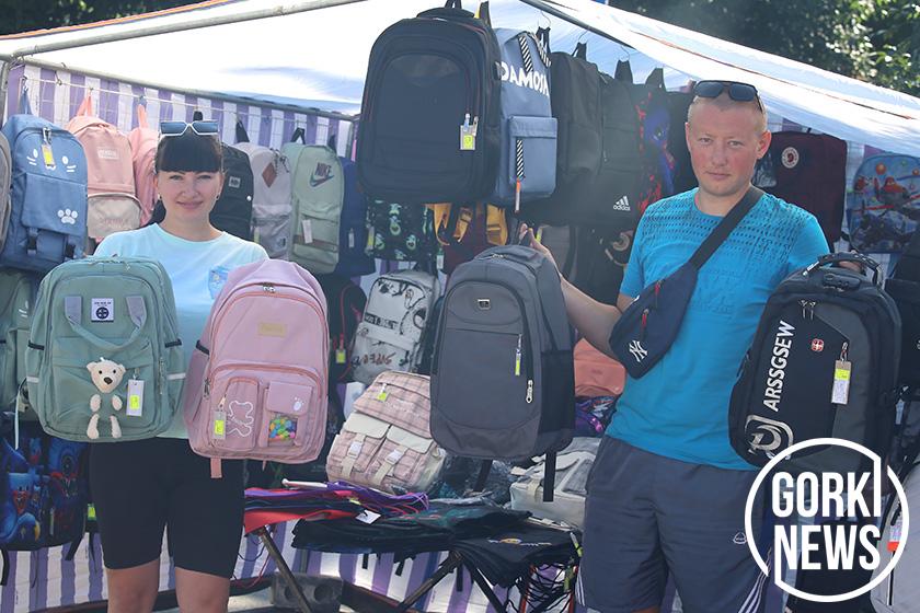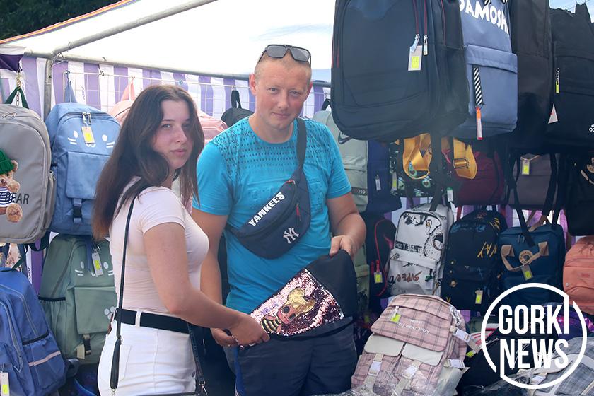 Предприниматель Андрей Тишкович вместе с женой Олесей предлагали приобрести рюкзаки. Они торгуют на Центральном рынке и сейчас решили присоединиться к коллегам на школьном базаре.