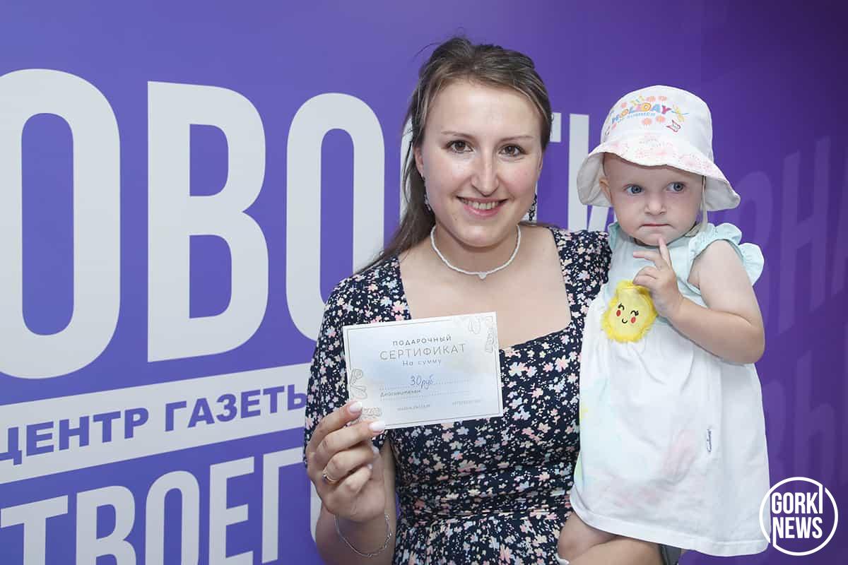 Сертификат на 30 рублей блогер Мария Копысова (@masha_pasta.pf), которая пришла вместе со своей маленькой доченькой Алисой передала Ларисе Кривицкой.