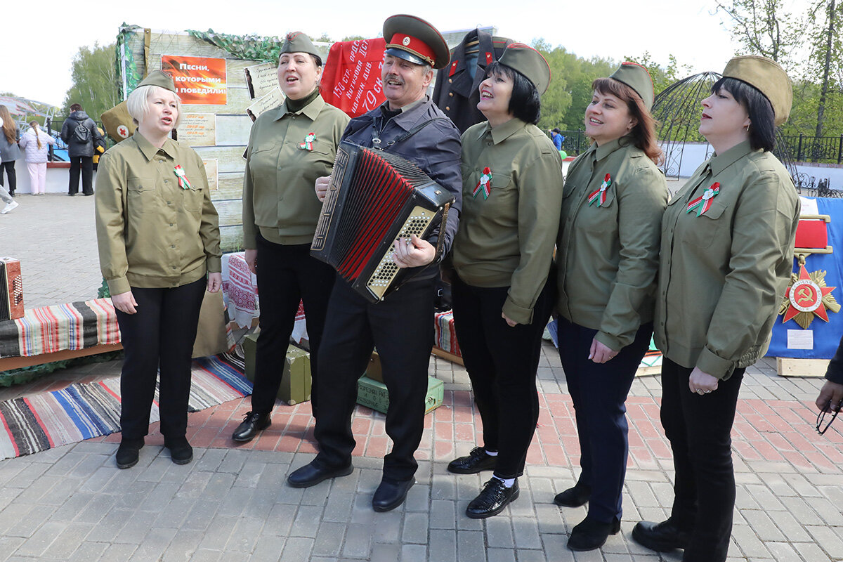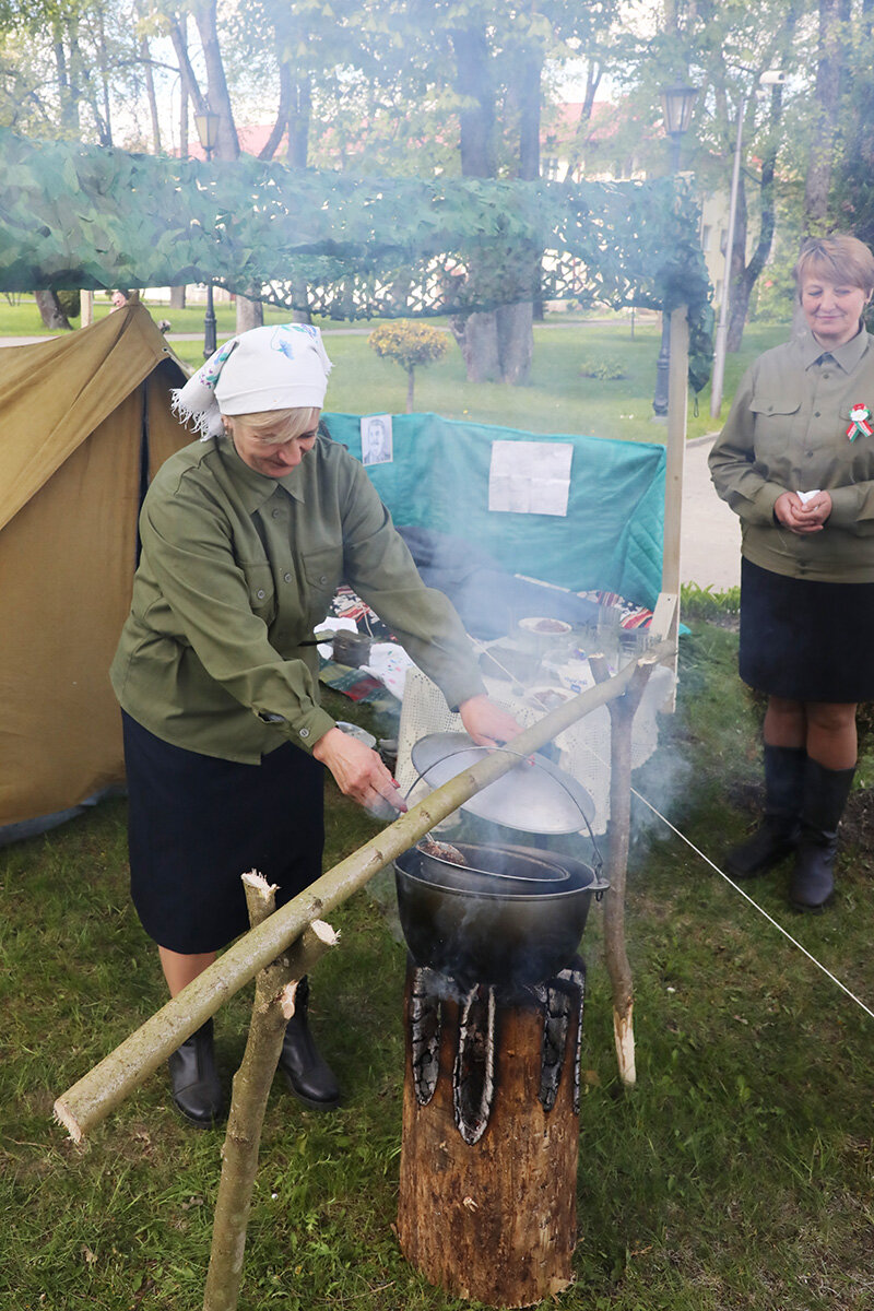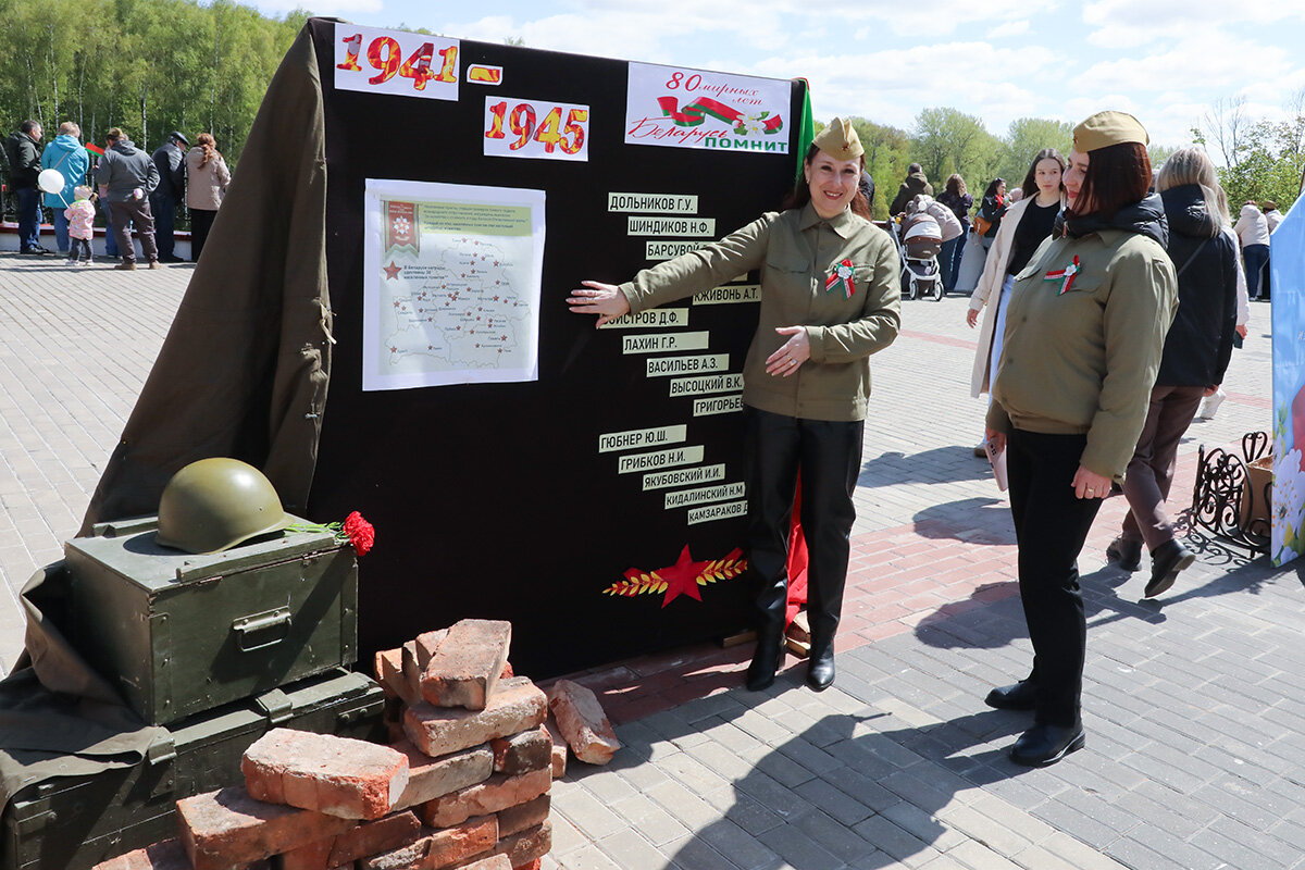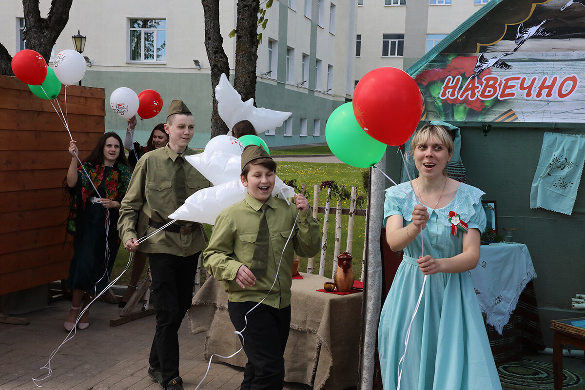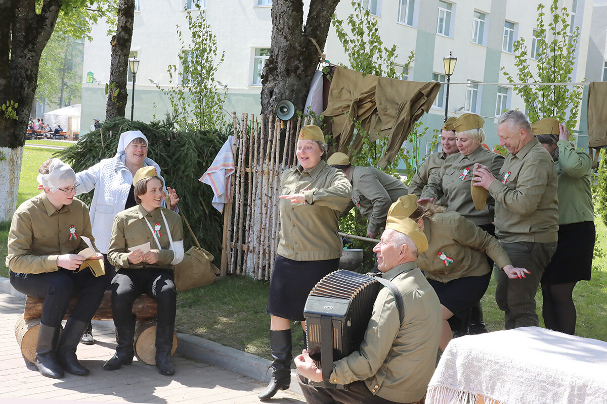 Присутствующие смогли окунуться в атмосферу тех лет благодаря военным площадкам, где играли и пели военные песни, были показаны фотографии тех лет, портреты героев горецкой земли, военная форма и вещи.